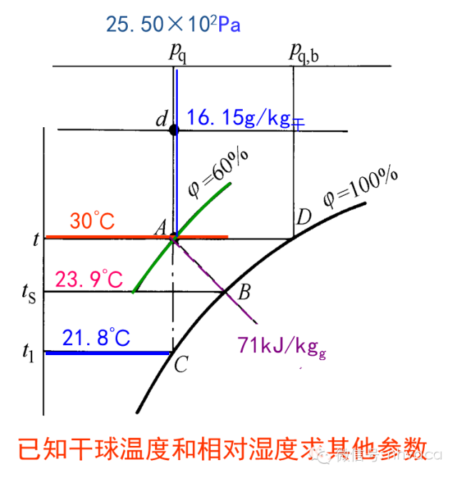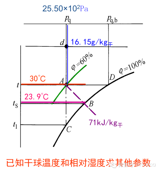2)由过A点的45°斜线查得其焓为71kJ/kg干,过A点的垂直线查得其含湿量为16.15g/kg干,水蒸气分压力为25.50×102Pa。