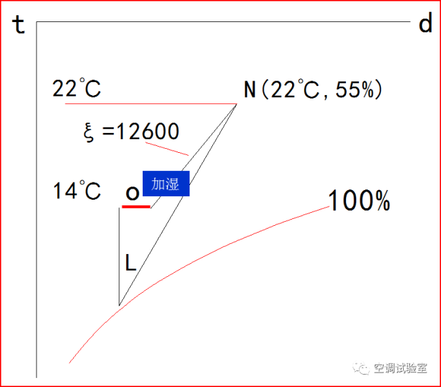 (2) 在I-d图上,标定房间回风温度点N,画热湿比线,取送风温差8 ℃,就可以得到送风温度点O,送风露点L。I-d图如下