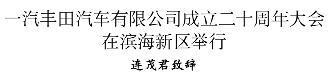 9月9日,一汽丰田汽车有限公司成立二十周年大会在滨海新区举行。区委书记连茂君出席并致辞。中国第一汽车集团有限公司党委书记、董事长邱现东,丰田汽车公司专务、中国亚洲本部长上田达郎,丰田汽车公司执行董事、首席生产官新乡和晃出席。