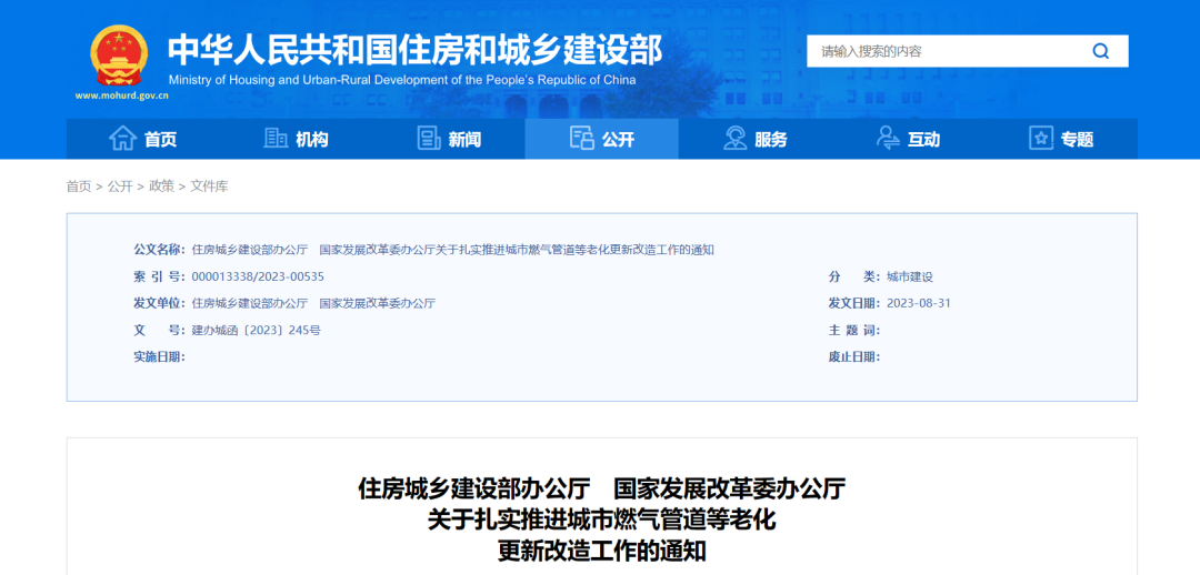 编者按:近日,住建部办公厅、发改委办公厅联合发布《关于扎实推进城市燃气管道等老化更新改造工作的通知》(建办城函〔2023〕245号)(下称“《通知》”)。《通知》是为落实国务院《城市燃气管道等老化更新改造实施方案(2022—2025年)》和《全国城镇燃气安全专项整治工作方案》要求,对推进2023年城市燃气管道等老化更新改造工作,靠前谋划2024年改造计划向各地住建、发改等部门提出的要求。
