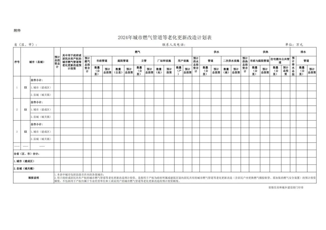 谋划2024年城市燃气管道等老化更新改造计划任务,要牢牢抓住让人民群众安居这个基点,结合全国城镇燃气安全专项整治工作,从维护人民群众生命财产安全、促进城市安全运行的需要出发,进一步加大工作力度。各地要坚决落实党中央、国务院关于遏止新增地方政府隐性债务的决策部署,坚持尽力而为、量力而行,按照“实施一批、谋划一批、储备一批”,自下而上抓紧研究确定更新改造计划,有针对性地做好项目储备和资金需求申报工作,变“钱等项目”为“项目等钱”。要坚持早部署、早安排、早实施,2024年计划改造项目应于今年启动项目立项审批、改造资金筹措等前期工作。各省(区、市)住房城乡建设部门要会同发展改革等有关部门单位,组织市、县抓紧研究提出本地区2024年城市燃气管道等老化更新改造计划任务及项目清单,汇总填写《2024年城市燃气管道等老化更新改造计划表》(见附件),报经省级人民政府同意后,于2023年9月30日前分别报住房城乡建设部、国家发展改革委。
