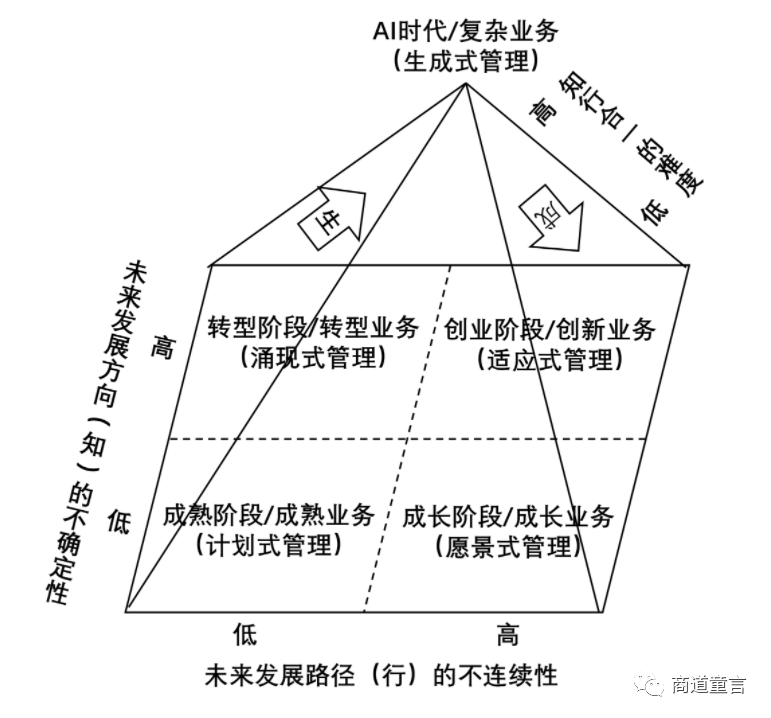 在信息爆炸且便捷的互联网时代,计划式管理容易让企业忽视外部信号,导致组织僵化,错失发展机遇。过多的市场信号也会导致采用涌现式管理的企业在市场中随机漫步和无序扩张,虽然看到多向的发展路径却无法一力贯之。因此,缺乏高速处理海量信息能力的企业,无论是采取适应式、愿景式、计划式、涌现式管理中的哪一种,都难以创造最优绩效。面对错综复杂的外部环境和多元业务组合,企业可以借鉴生成式人工智能技术的逻辑,尝试生成式人工智能管理逻辑。在发散阶段,生成式人工智能管理机制从各个业务获取海量信息,对企业决策模型进行预训练,使其能够学习数据中的规律和模式,进而预判企业后续的经营方向和未来状况。在收敛阶段,经过训练的模型进入决策辅助模拟阶段,生成的数据供管理者参考。管理者同时对模型输出的决策方案进行评估,以便于后续改进模型和提高生成结果的质量。在实践中,企业采取的自下而上与自上而下结合的决策方式,就有生成式管理的模式。随着企业的不断发展和外部环境的快速变化,很多企业在同一时点拥有创新业务、成长业务、成熟业务和转型业务等组合。这些业务分别面对不同的发展方向不确定性和发展路径不连续性。为了应对各类业务面对的机遇和挑战,企业将服务于不同类型的用户,采用相应的组织结构,发展符合用户需求的产品,并尝试在各不相同的市场环境中进行竞争合作。于是企业管理的复杂程度开始指数级上升。