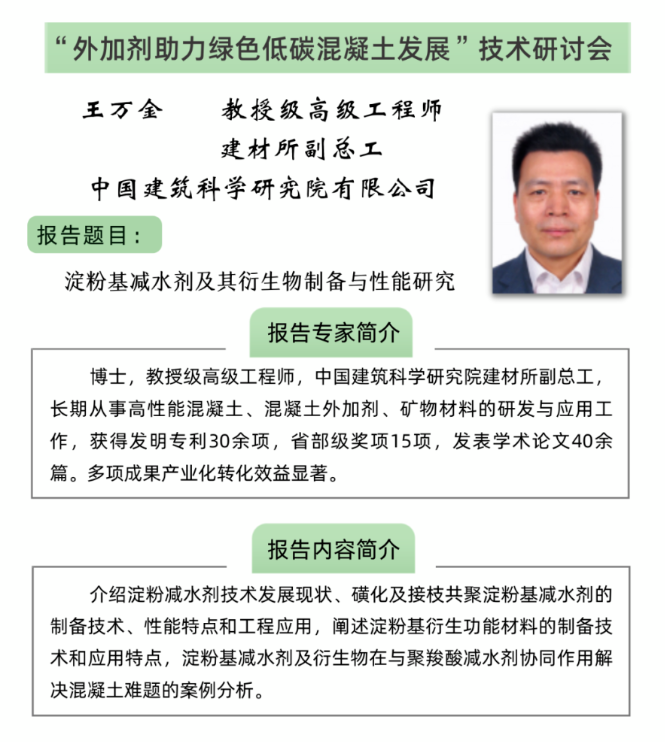 9月10日下午,我司王万金教高将在分会场B组(金穗厅)作《淀粉基减水剂及其衍生物制备与性能研究》报告。
