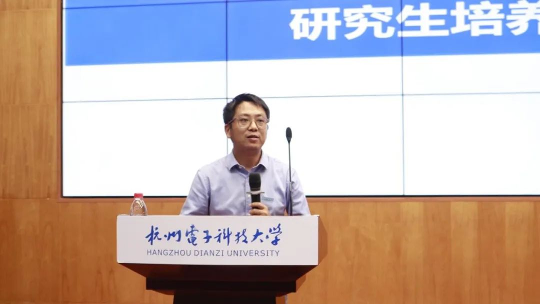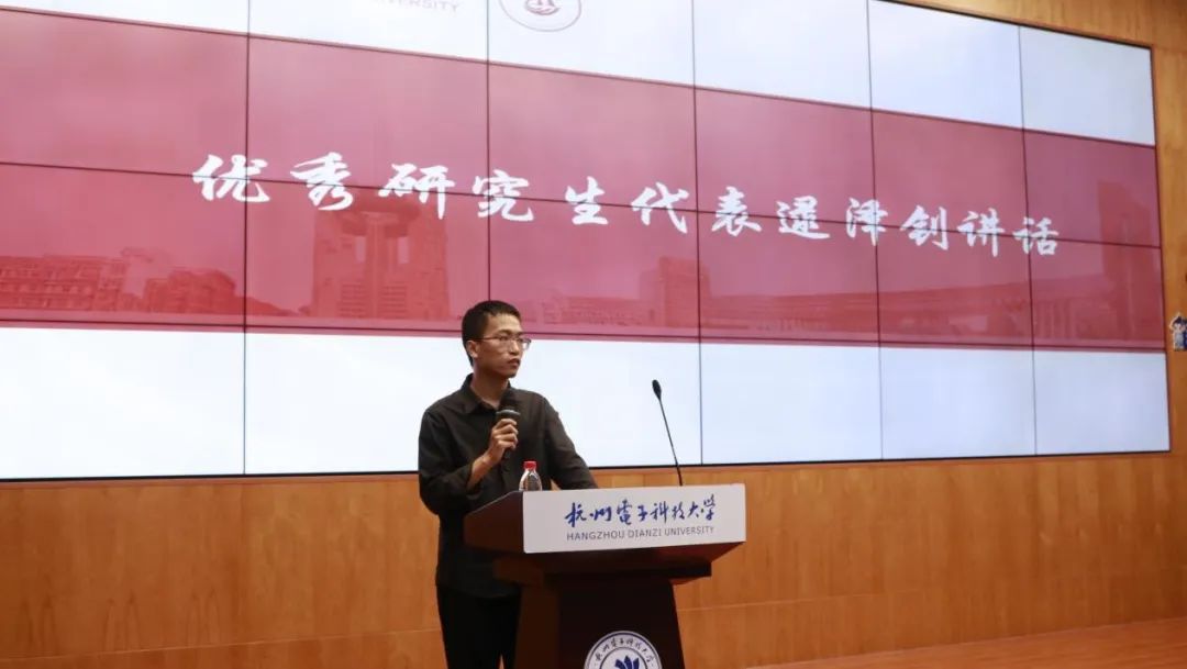 优秀研究生代表逯泽钊寄语新生。他贴近新生实际,近距离地向新生分享了自己的研究生生活感悟,分享了自己在竞赛与学术工作中的经验与收获,并表示研究生学习充满了希望和挑战,建议同学们培养适合自己的爱好,勇于离开宿舍“舒适圈”,以饱满的精神状态和严谨的学习作风度过研究生生涯。