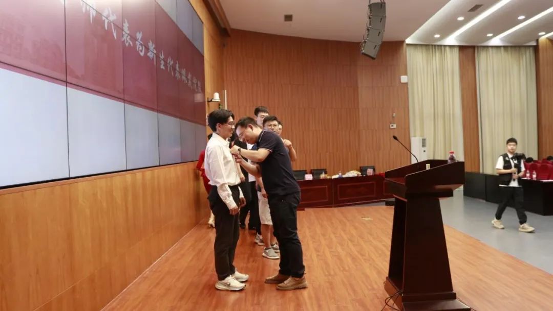 会议伊始,机械工程学院导师代表何利华老师、蒙臻老师、王洪成老师、郭龙川老师为新生代表佩戴院徽。院徽象征着机械工程学院的团结和力量,新生们代表心怀感激,佩戴上院徽奔赴更好的研究生生活。