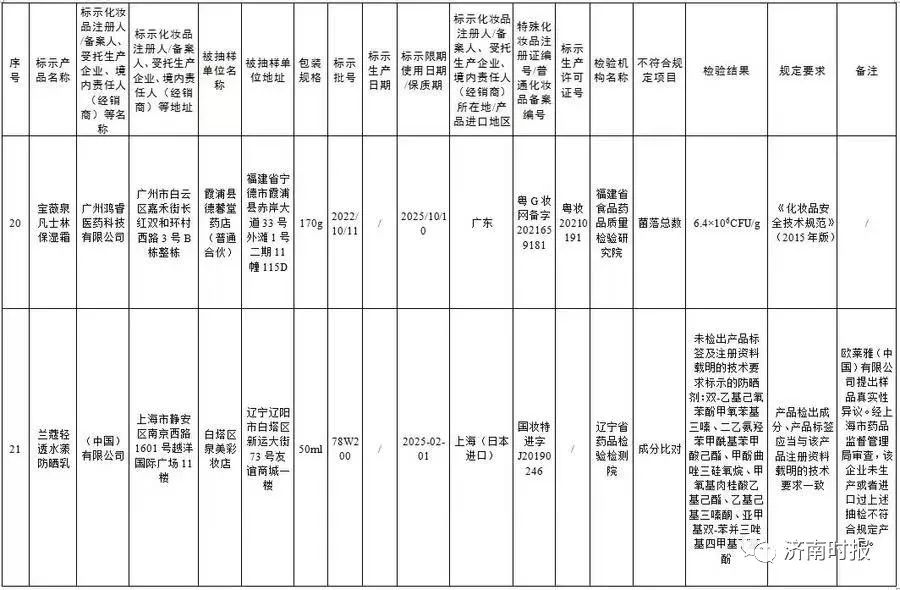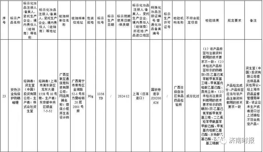 产品标签标示为广州市天科化妆品有限公司生产的天科染发膏(自然黑)、产品标签标示为资生堂(中国)投资有限公司销售的安热沙金灿倍护防晒啫喱、产品标签标示为广州市绮易美化妆品有限公司生产的塑美大健康隔离防晒乳、产品标签标示为南京同仁堂健康产业有限公司总经销的皙世花容防晒乳(2号)、产品标签标示产品名称为兰蔻轻透水漾防晒乳等23批次化妆品不符合规定。