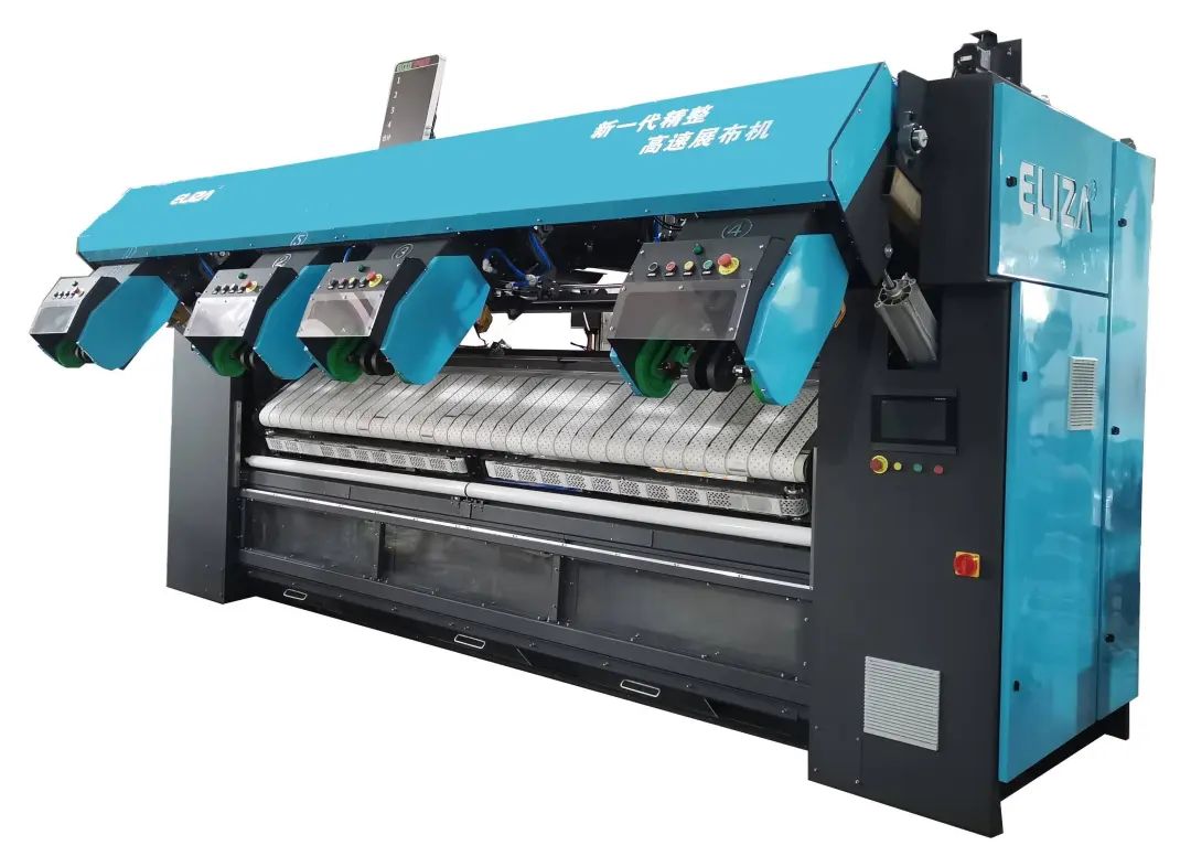 具有布草吸风抽湿刷平功能,提高布草平整度;四工位同步传动设计,自动化程度高,提高工作效率,节约人力成本