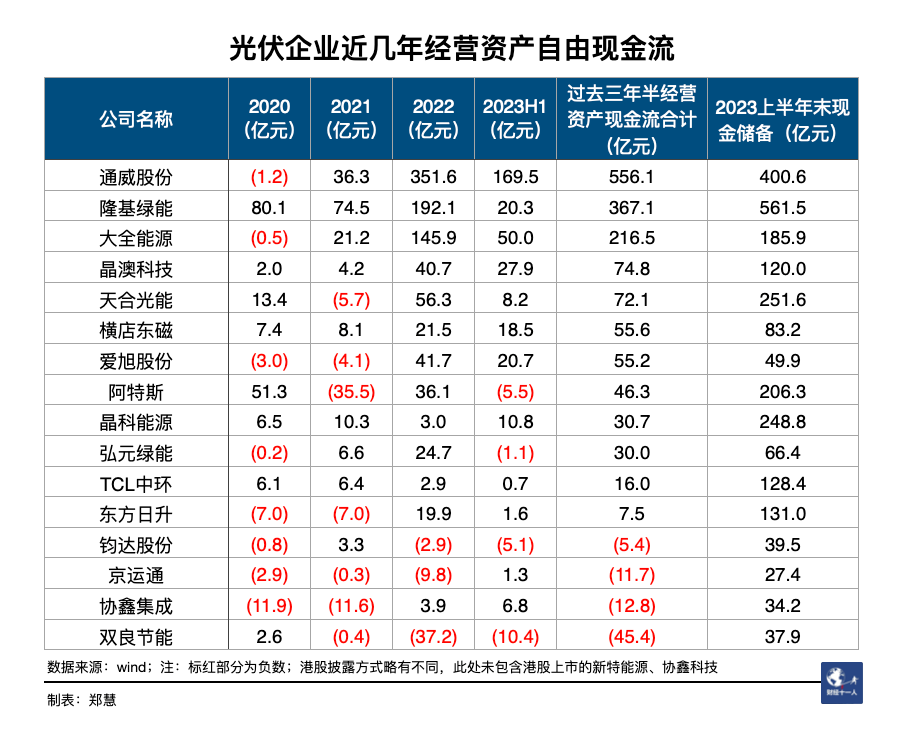 除通威、隆基以外,对比其他几家头部一体化公司:晶澳科技、天合光能自身造血能力较好,但晶澳科技的现金储备最少;晶科能源、阿特斯现金储备较多,但自身造血能力一般,其中,晶科的经营资产自由现金流在今年上半年才稍有起色,阿特斯则不太稳定;东方日升在头部一体化公司中,资金实力相对较弱。