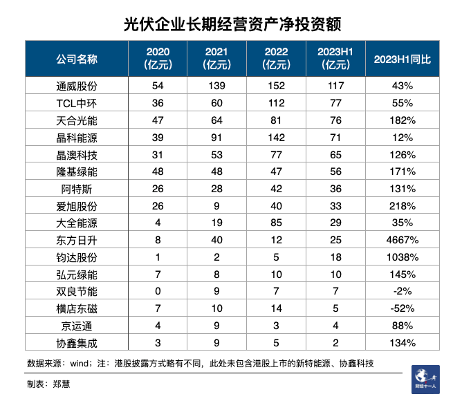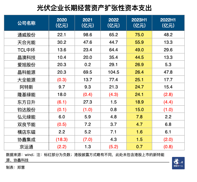2023年上半年,通威股份的扩张性资本支出居首位。据半年报披露,其投资的电池、组件均为N型高效产能。