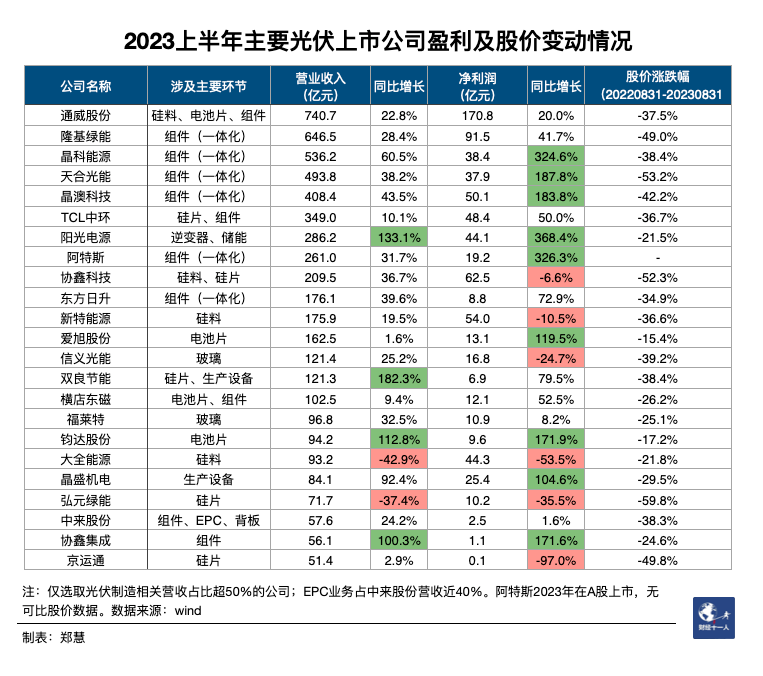 上半年,光伏产业链中有23家上市公司营收超过50亿元。其中16家公司营收同比增长超过20%,9家公司实现净利润同比翻番。