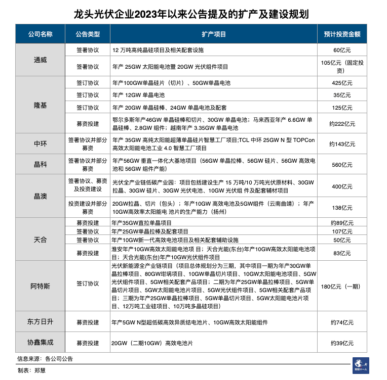 据《财经十一人》不完全统计,头部光伏企业在上半年均公告了总投资上百亿的扩产规划。