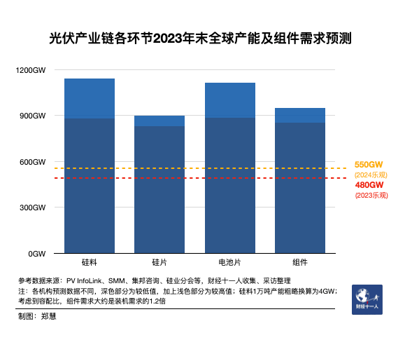 综合各机构预测数据,2023年底,全球硅料、硅片、电池片、组件四个环节的产能将超过800GW。如果所有扩产公告基本按期实现,硅料、电池片环节产能将超过1100GW,硅片、组件环节产能将达到900GW。这将远超2023年、2024年480GW~550GW的组件需求。
