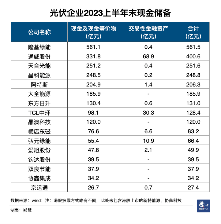 由于交易性金融资产相对容易变现,我们将这部分也视作企业可灵活动用的现金。加总后可以看到,有9家上市光伏企业现金储备超过100亿元,其中隆基绿能、通威股份的资金分别高达561.5亿元、400.6亿元。
