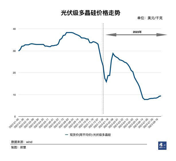 产业链各环节,尤其是硅料环节的产能跃进,带来了供需关系的转变,2023上半年,硅料价格猛跌,下游环节也随之降价。
