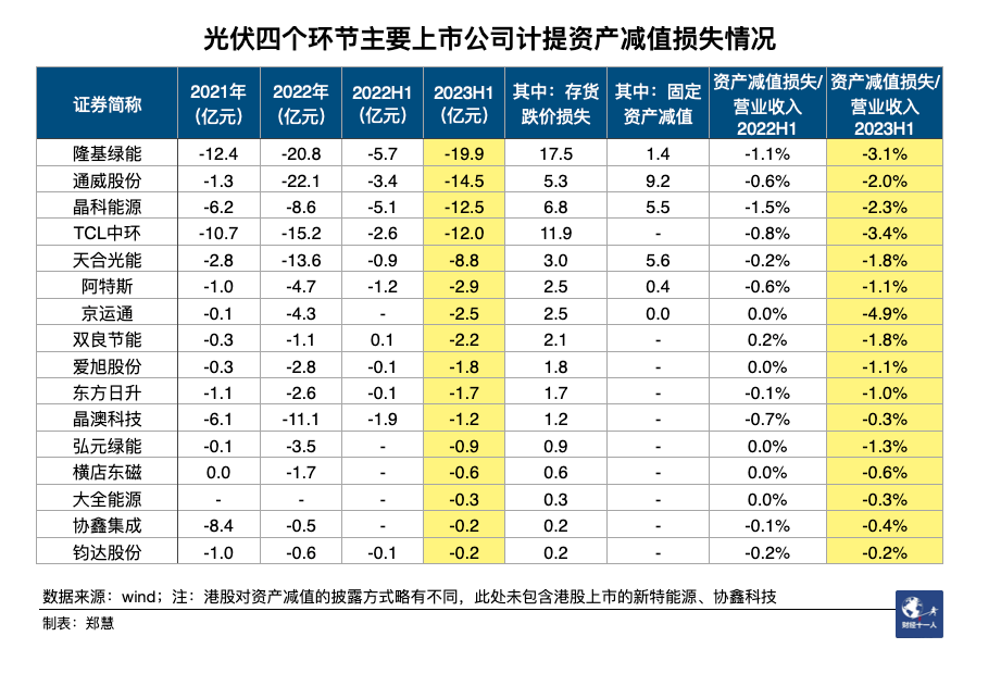 其中,隆基绿能上半年计提了19.9亿元资产减值损失,接近2022年全年水平,其中17.5亿元为存货跌价损失。此外,通威股份、晶科能源、TCL中环、天合光能等头部公司的减值准备也大大增加。