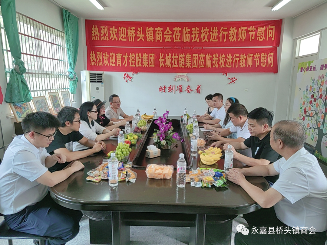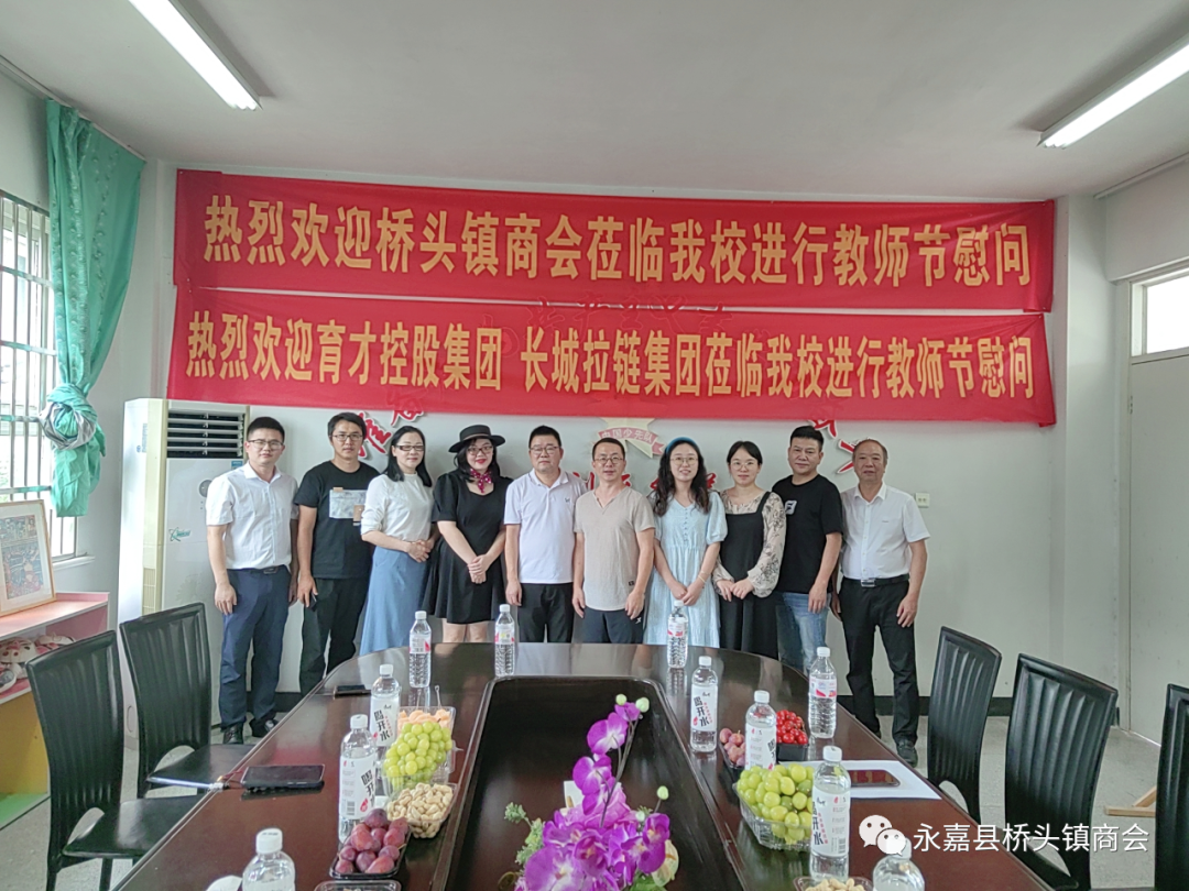 2023年9月8日,在第39个教师节即将来临之际,由永嘉县桥头镇商会、育才控股集团有限公司、长城拉链集团有限公司组成的慰问组到桥头镇九小开展教师节慰问活动,看望慰问一线教师,并向广大教师和教育工作者致以节日祝福和诚挚问候。