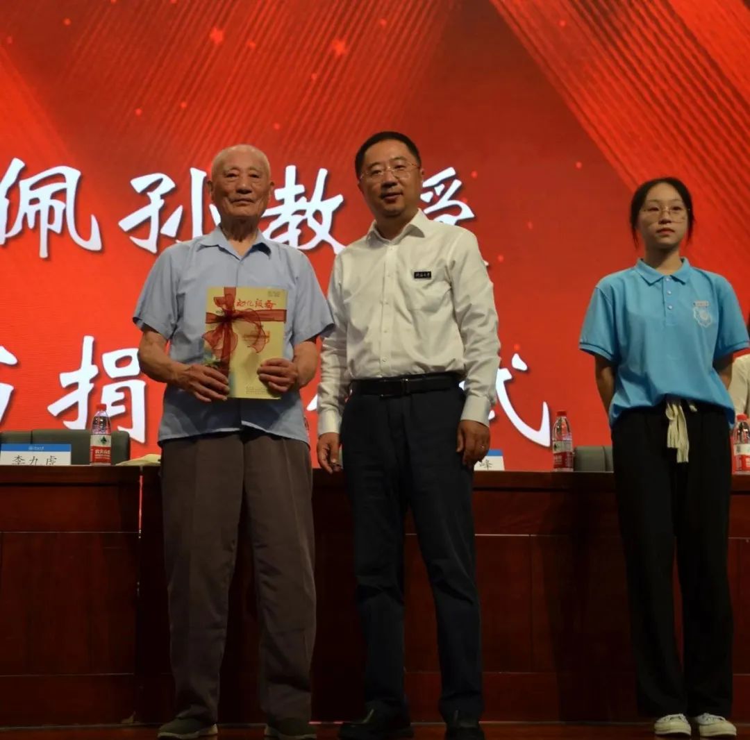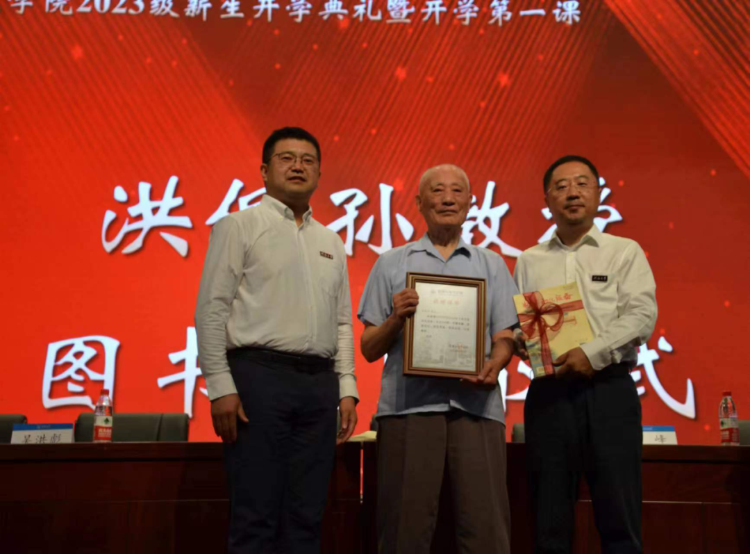 院史首位系主任洪佩孙教授为学院捐赠图书,吴峰院长、吴洪彪书记为其颁发证书。