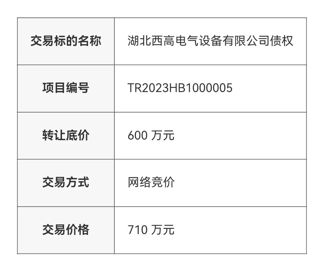 成交公告 | 湖北西高电气设备有限公司债权