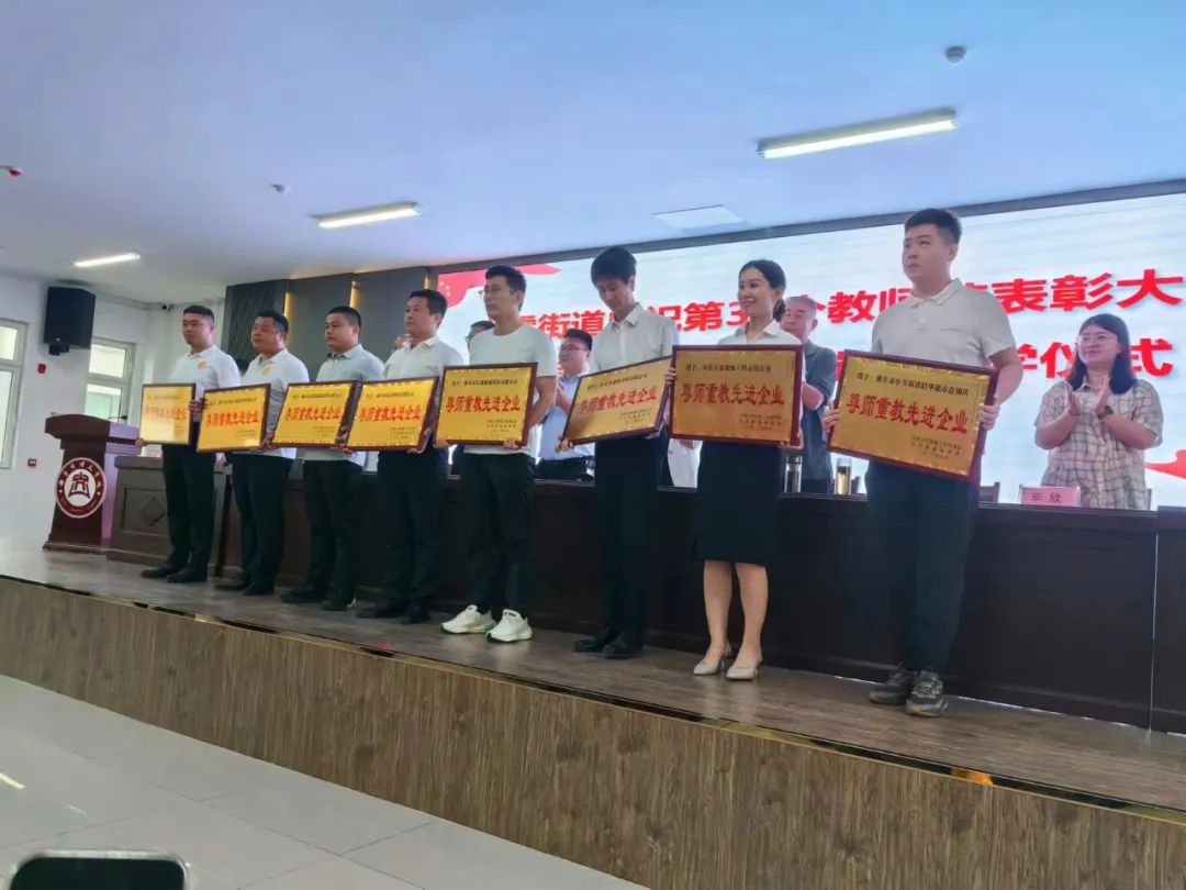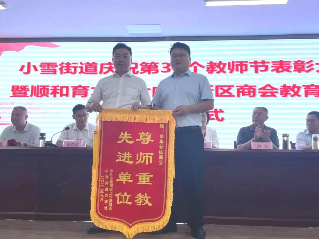 心存大爱满校园,杏林声声育四方。9月10日上午,庆祝第39个教师节暨曲阜新区商会教育基金捐赠仪式在曲阜市博文学校学术报告厅隆重举行。曲阜新区商会再次向小雪街道中心中学捐赠十万元教育基金,爱心助力教育事业发展,向一线教师致以节日的祝福和诚挚的问候。曲阜新区商会再次获得“尊师重教先进单位”荣誉称号,54家会员企业获“尊师重教先进企业”荣誉称号。