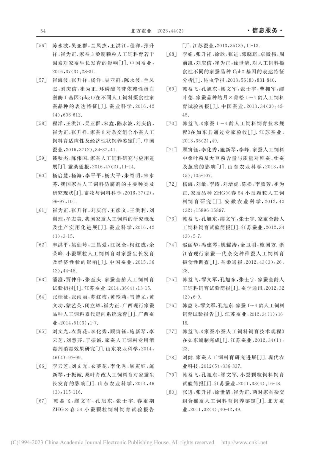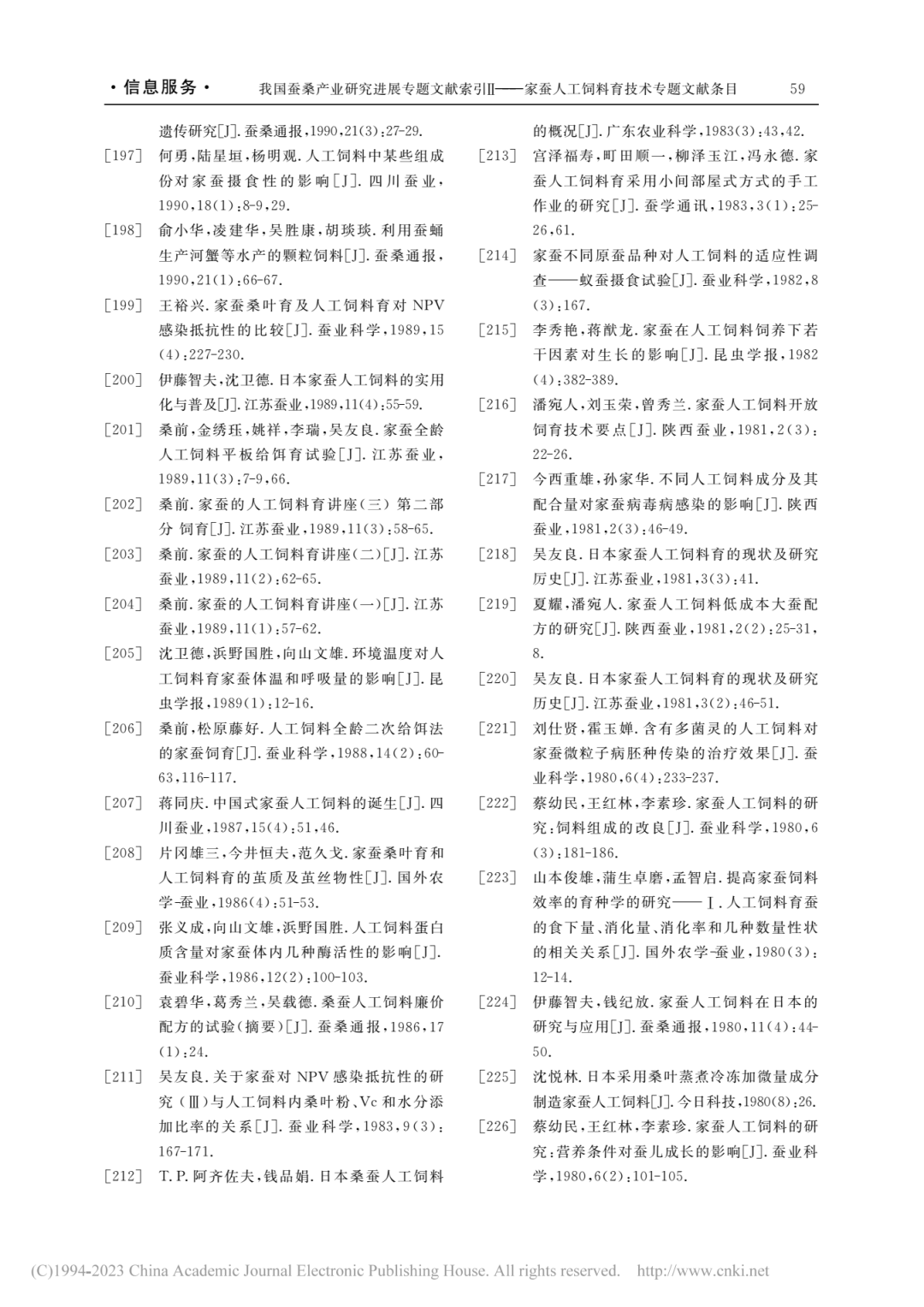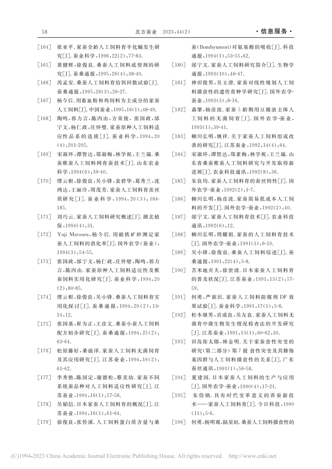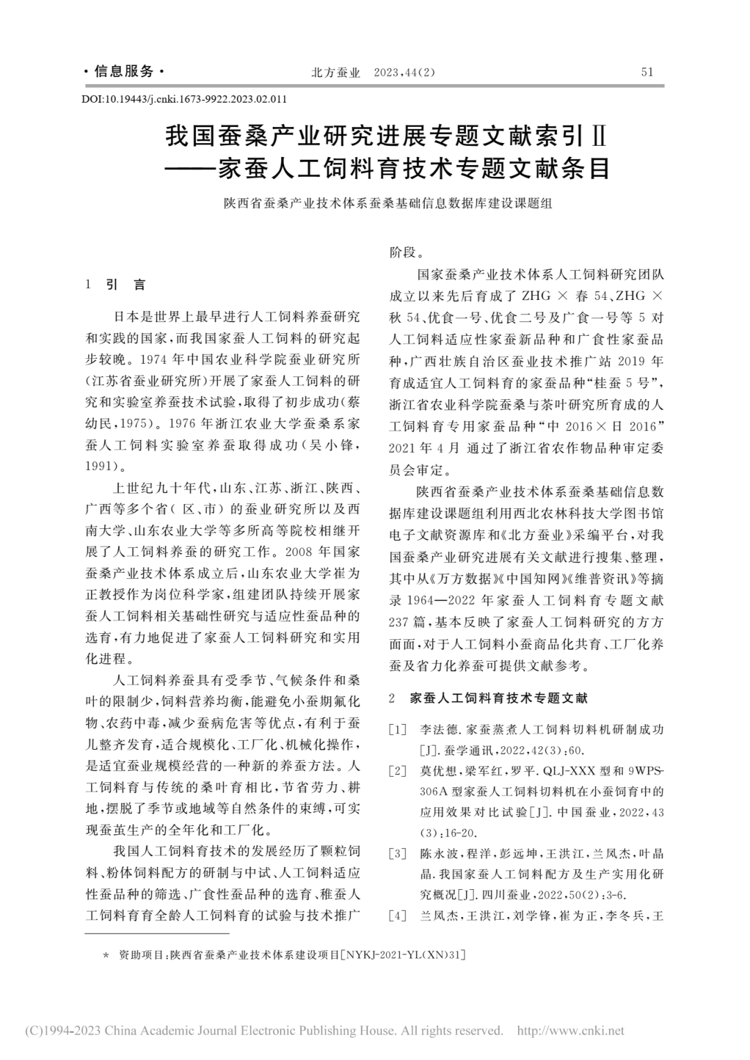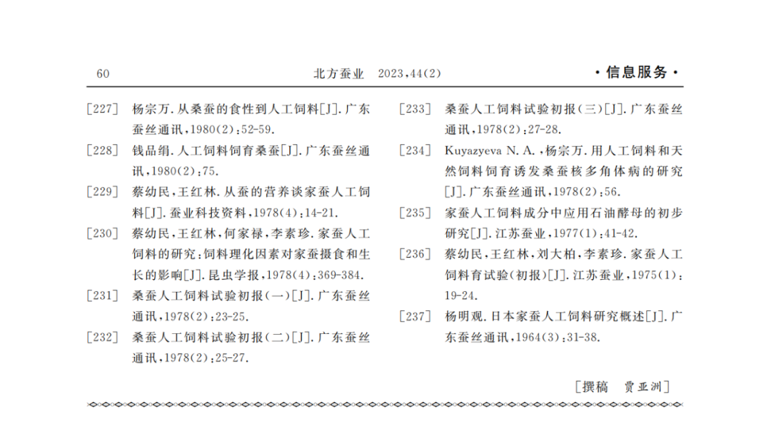 陕西省蚕桑产业技术体系蚕桑基础信息数 据库建设课题组利用西北农林科技大学图书馆 电子文献资源库和《北方蚕业》采编平台,对我国蚕桑产业研究进展有关文献进行搜集、整理, 其中从《万方数据》《中国知网》《维普资讯》等摘 录 1961-2022年家蚕人工饲料育专题文献237篇,基本反映了家蚕人工饲料研究的方方面面,对于人工饲料小蚕商品化共育、工厂化养蚕及省力化养蚕可提供文献参考。