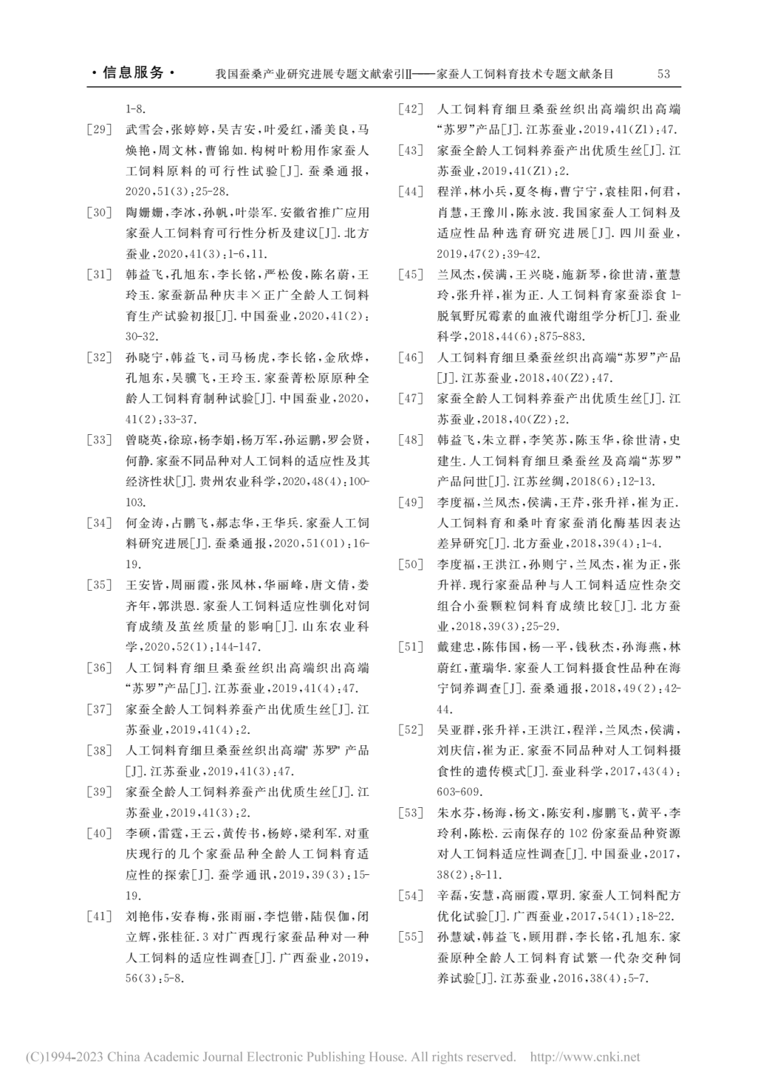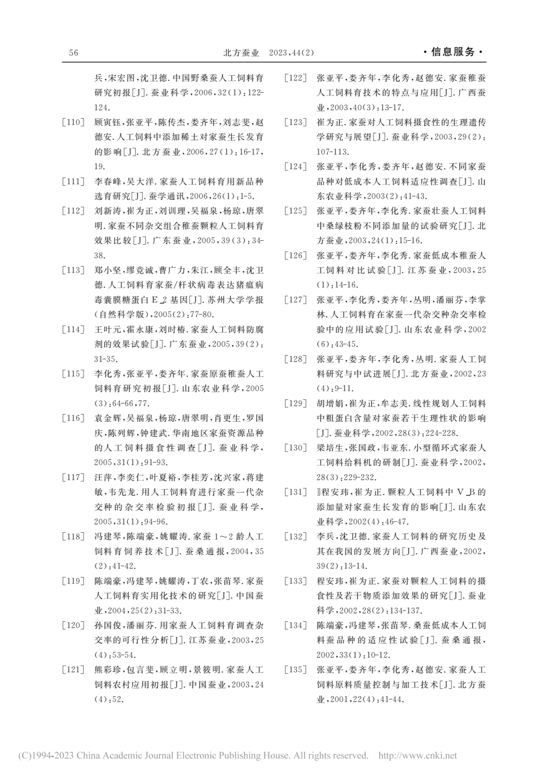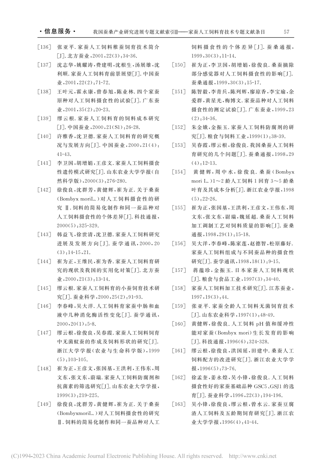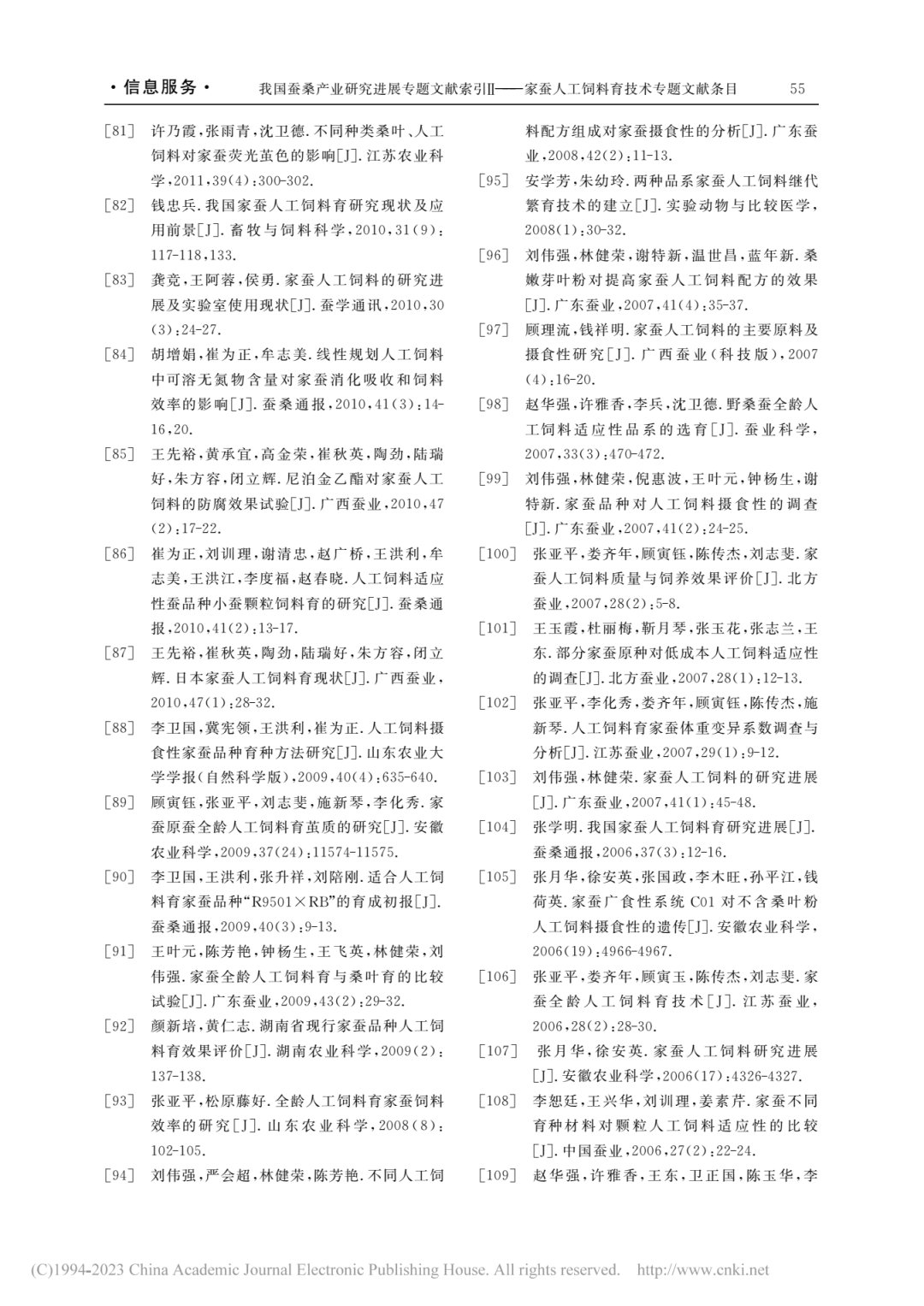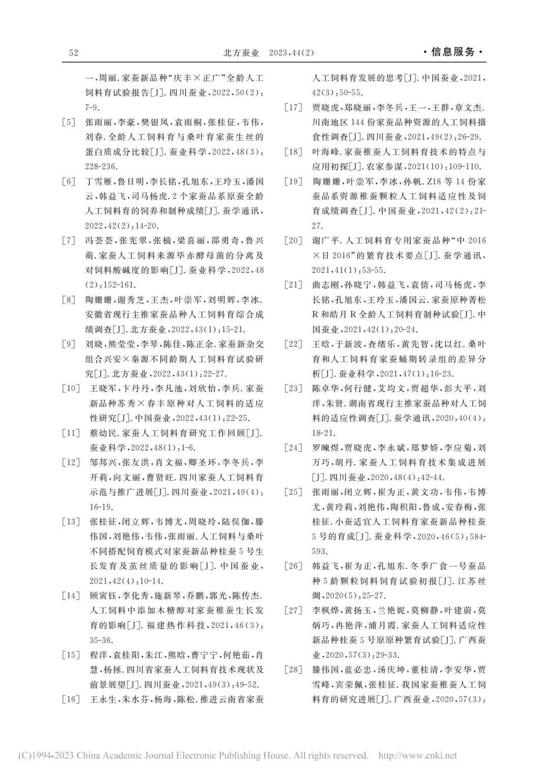 陕西省蚕桑产业技术体系蚕桑基础信息数 据库建设课题组利用西北农林科技大学图书馆 电子文献资源库和《北方蚕业》采编平台,对我国蚕桑产业研究进展有关文献进行搜集、整理, 其中从《万方数据》《中国知网》《维普资讯》等摘 录 1961-2022年家蚕人工饲料育专题文献237篇,基本反映了家蚕人工饲料研究的方方面面,对于人工饲料小蚕商品化共育、工厂化养蚕及省力化养蚕可提供文献参考。