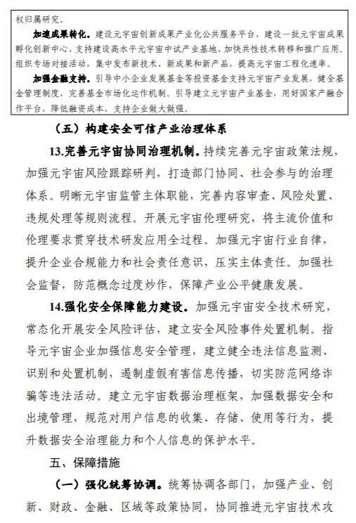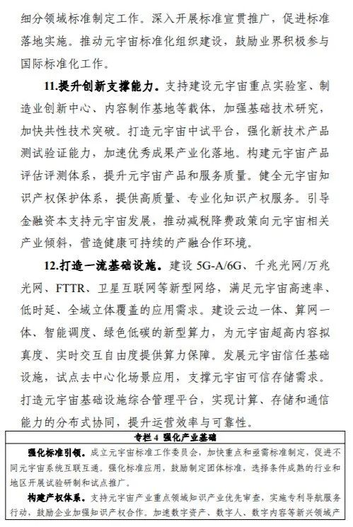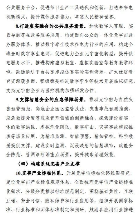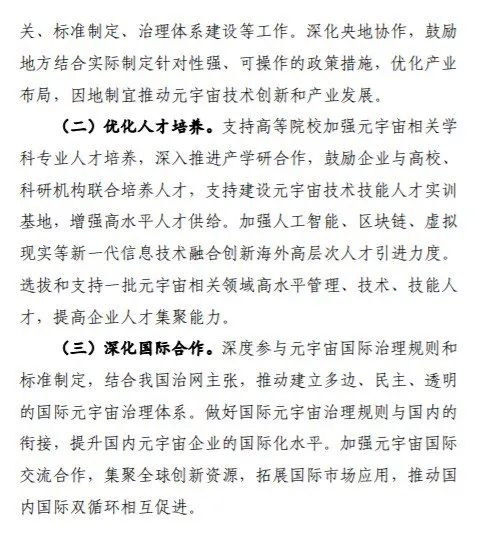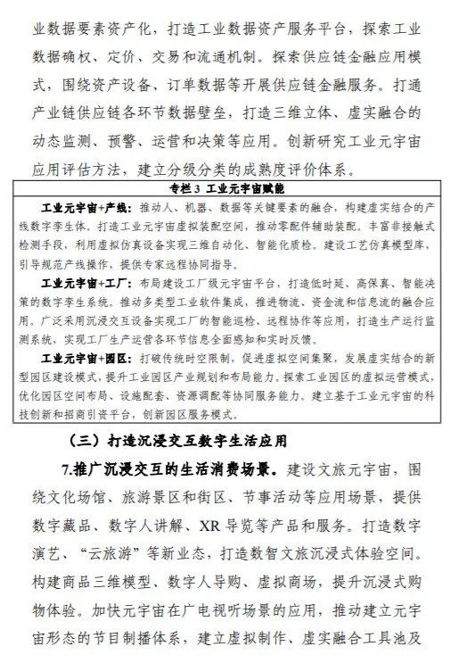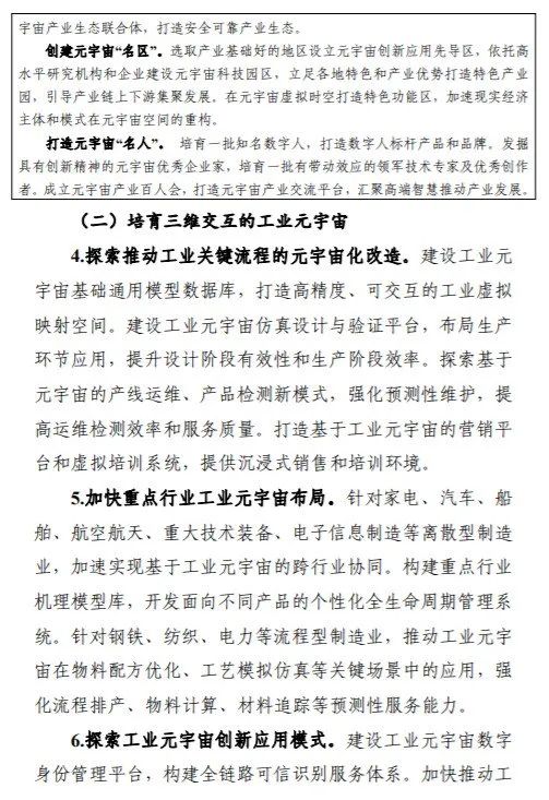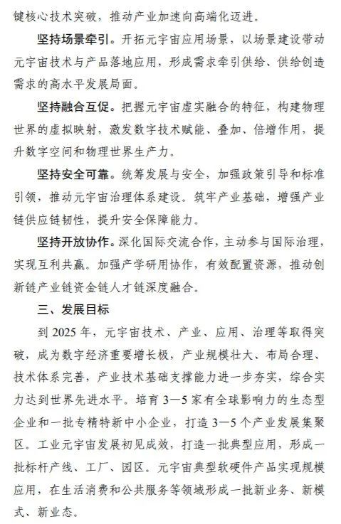 其中提到,到2025年,元宇宙技术、产业、应用、治理等取得突破,成为数字经济重要增长极,产业规模壮大、布局合理、技术体系完善,产业技术基础支撑能力进一步夯实,综合实力达到世界先进水平。培育3—5家有全球影响力的生态型企业和一批专精特新中小企业,打造3—5个产业发展集聚区。工业元宇宙发展初见成效,打造一批典型应用,形成一批标杆产线、工厂、园区。元宇宙典型软硬件产品实现规模应用,在生活消费和公共服务等领域形成一批新业务、新模式、新业态。
