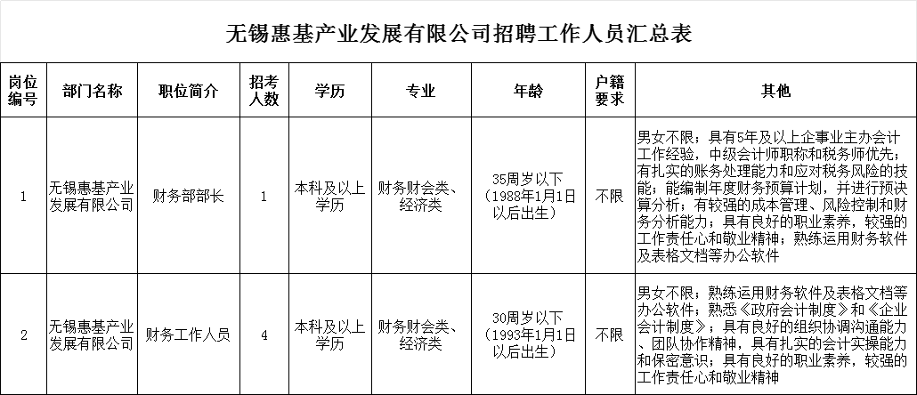 无锡惠基产业发展有限公司拟面向社会公开招聘工作人员5名,现将有关招聘事项公布如下: