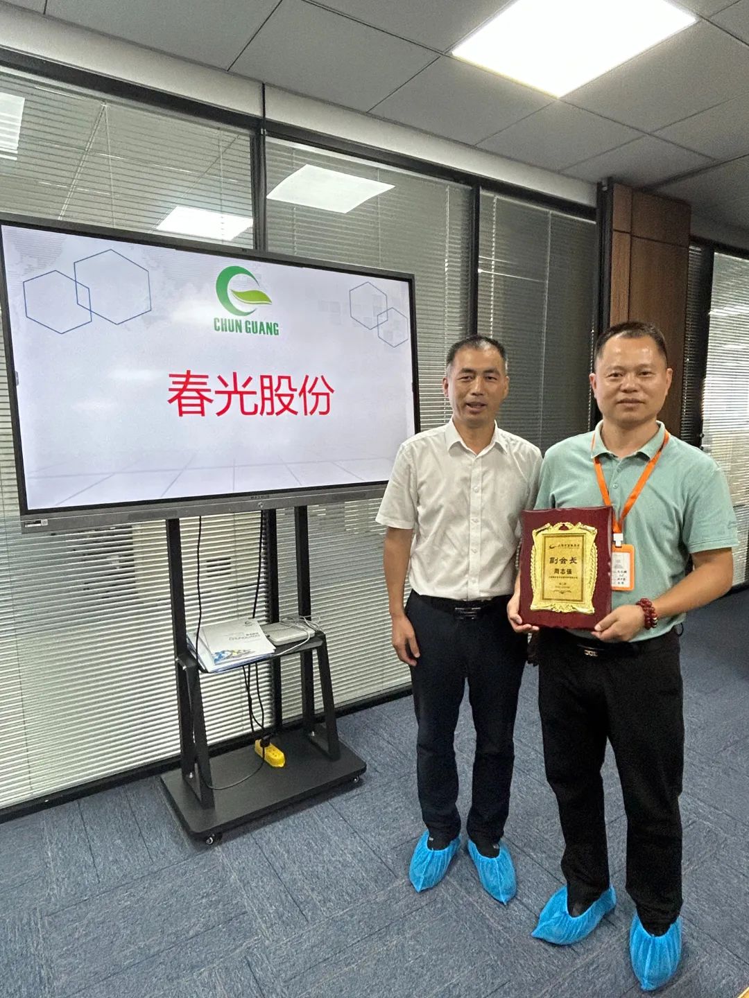 座谈会上,春光股份副总经理张友辉从企业概况、产品介绍、生产营销、企业战略、企业荣誉等方面对企业情况给大家做了介绍。春光股份有限公司获得了“江西省瞪羚企业”、“江西省著名商标”、“江西省专新特精中小企业”等一系列荣誉,营业额超过2亿,这离不开全体春光人的共同努力,也离不开政府、协会的支持,未来春光股份将不断秉承“自强不息、厚德载物、永不言弃、追求卓越”的企业精神,恪守“以客户为中心,以技术为先导,与时俱进地服务好客户”经营理念,立志成为“全球一流的保护健康产品高新材料科技公司”。最后,常务副会长项辉为周志强颁发商会副会长单位牌匾。