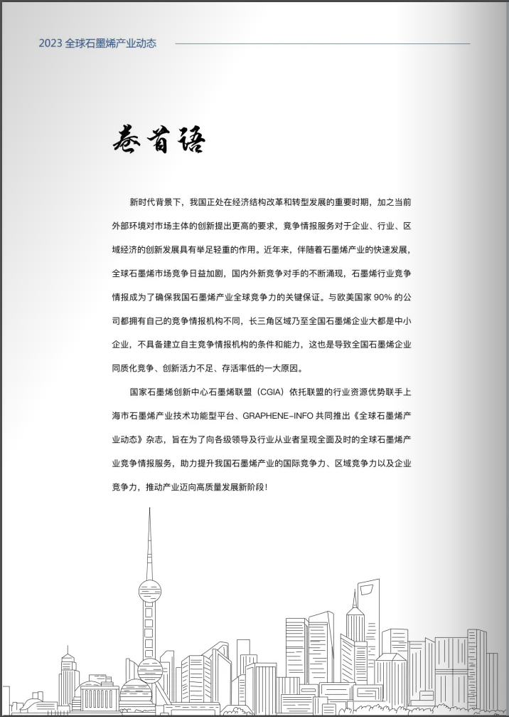 术业有专攻,专人做专事,石墨烯行业竞争情报服务,已成石墨烯产业发展的致胜武器。为此,石墨烯联盟(CGIA)联合国家石墨烯创新中心、上海市石墨烯产业技术功能型平台、Graphene-info等单位共同发布《2023全球石墨烯产业动态》,从产业角度出发,帮助政府及企业工作人员及时、详实、客观地了解到石墨烯的全球动态,从而对自身业务开展提供参考借鉴。