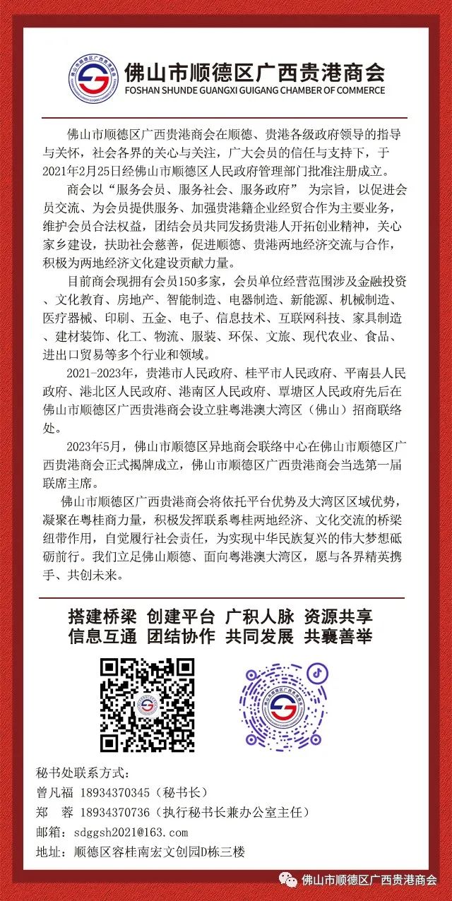 顺德区异地商会联络中心主席、顺德贵港商会会长曾南星首先对顺德海丰商会的热情接待及对顺德贵港商会、顺德区异地商会联络中心的支持表示衷心感谢。随后介绍了广西贵港的社会经济发展、营商环境及顺德贵港商会基本情况,指出我会在平台建设和招商引资方面凸显特点,商会重点围绕服务会员、服务社会、服务政府等方面开展工作;同时对联络中心未来的发展及如何加强商会与联络中心深度融合,整合资源为全体会员企业高质量发展赋能增效等方面提出建议与看法。曾会长表示,此次到访,一是增进友好商会互动交流,学习顺德海丰商会的优秀办会经验和办会理念,将结合自身实际与特点,汲取借鉴顺德海丰商会的经验做法,不断提升自身商会的建设水平;二是希望联动全区异地商会及各商会会员单位做好联络中心工作,赋能18家异地商会更好发展;曾会长指出,通过此次拜访,增强商会之间的情谊,拉近友好商会之间的距离,继续加强两商会的交流学习,相互借鉴工作方法和经验,取长补短,实现共同成长,共谋合作发展,实现互利共赢。顺德区异地商会联络中心将在区工商联的领导下,提振信心、团结会员、凝聚力量,充分发挥桥梁和纽带作用,进一步整合商会资源,为商会发展聚力、为会员企业赋能,沿着共商共创、守正发展的方向,以党建为引领,为各商会搭建更大的平台,实现更多商会资源共享、团结互助、抱团取暖,为会员提供更好的服务,持续提升商会的影响力、凝聚力、向心力和为会员企业发展推波助澜、保驾护航的能力。