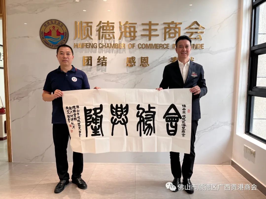 顺德区广西贵港商会会长曾南星向顺德区海丰商会会长巫古伟赠送书法作品