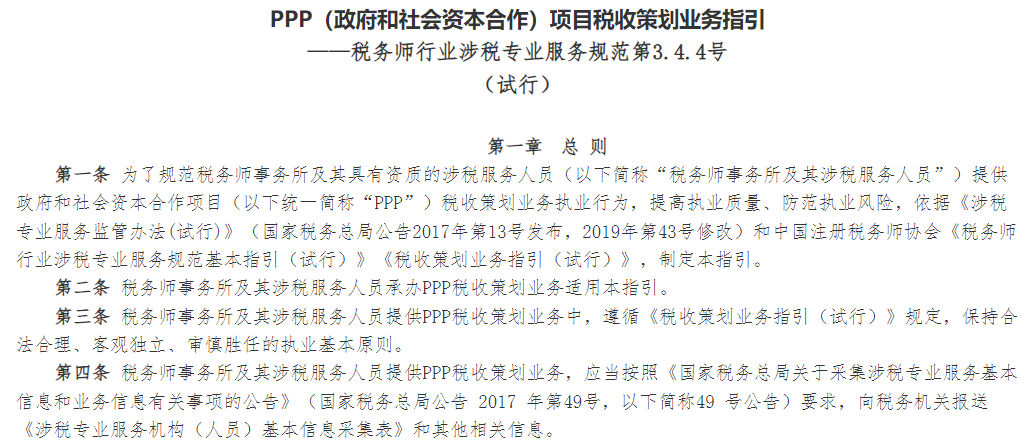 中税协发布了关于印发《PPP(政府和社会资本合作) 项目税收策划业务指引(试行)》 等六项指引(指南)的通知,其中提到:
