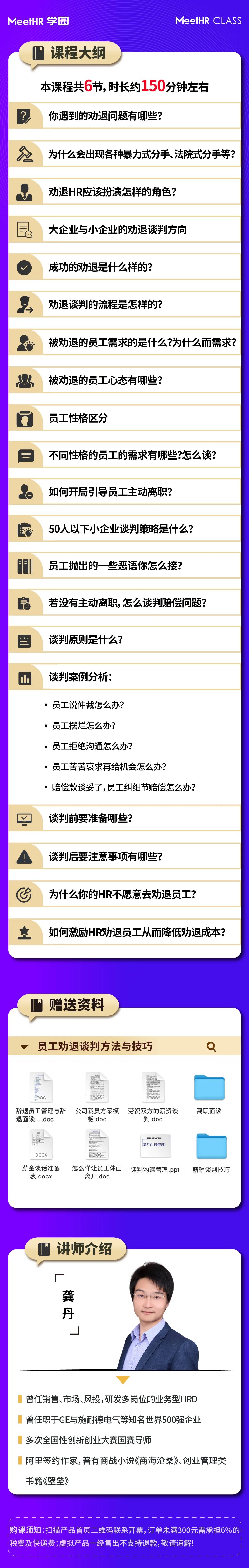 特别是后疫情时代,企业成本增加,压力巨大,公司面临各种挑战;00后的崛起,开始整顿职场,人效出现下滑;抖音快手等短视频的出现,将信息透明化,不再具有信息差;作为老板的你是否遇到过你的HR员工很抵触劝退,并且劝退无效,每一次劝退,公司都损失惨重?作为HR的你是否经常被老板和业务部嫌弃,说你做不到员工劝退。但你很无奈,你说公司不赔钱,而且公司不占理,你让我怎么做?你很无辜。这不就像销售产品卖不出去,老板骂销售部,你们一群废物,公司养你们干什么的?而作为销售人员心里委屈,产品质量不如别人,产品价格又高于竞争对手,售后服务又跟不上,你让我们销售怎么卖吗?这一切的一切都是基于社会在进步,员工也在进步,法律几乎几十年都没有变化过,而我们的企业和HR谈判水平没有进步,导致员工劝退时难度大大增加,无从下手。因此MeetHR携手龚丹老师针对于这种现象开发了一门课程《HR接到劝退任务后如何开展工作》,重点在于谈什么?怎么谈?方法是什么?策略是什么?话术是什么?本门课程内容都来自于价值6000元/人的谈判技巧课,经过与人力资源学科、人力资源工具融合而成,形成了专门针对人力资源的谈判方法与技巧,更贴近人力资源管理、更贴近HR工作需要。