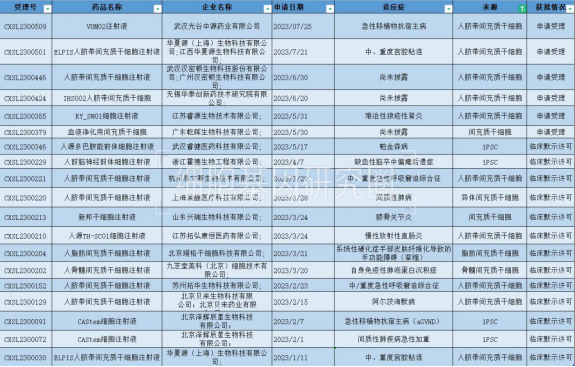 截止今年7月,递交IND申请的干细胞疗法共有19个(以受理号记),如图:
