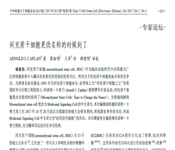 [3] Arnold L. Caplan著,廖联明,王萍译。间充质干细胞更改名称的时候到了.中华细胞与干细胞杂志,2017,7(5):253-258