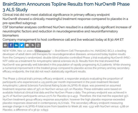 简单地说,NurOwn 未能达到主要终点指标和关键次要终点,其在减缓与 ALS 相关的功能衰退方面并不比安慰剂好,也就是说NurOwn®治疗渐冻人症的 Ⅲ期临床试验失败。