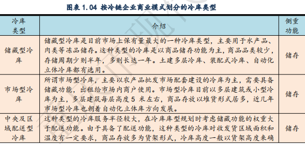 根据目前主流冷链企业的商业模式,对应的冷库类型可分为储藏型、市场型、中央