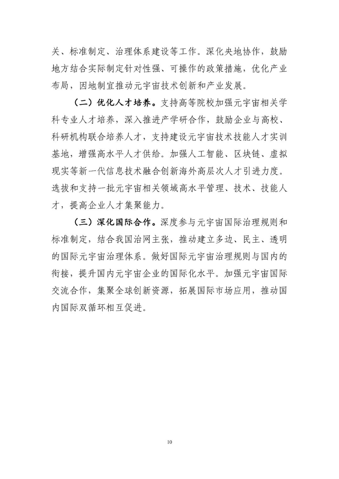 一是强化统筹协调。统筹协调各部门,加强产业、创新、财政、金融、区域等政策协同。深化央地协作,鼓励地方结合实际制定针对性强、可操作的政策措施,优化产业布局。二是优化人才培养。包括支持高等院校加强元宇宙相关学科专业人才培养,鼓励企业与高校、科研机构联合培养人才,支持建设元宇宙技能技术人才实训基地,加大海外高层次人才引进力度等。三是深化国际合作。深度参与元宇宙国际治理规则和标准制定,做好国际元宇宙治理规则与国内的衔接,推动建立多边、民主、透明的国际元宇宙治理体系。加强元宇宙国际交流合作,推动国内国际双循环相互促进。
