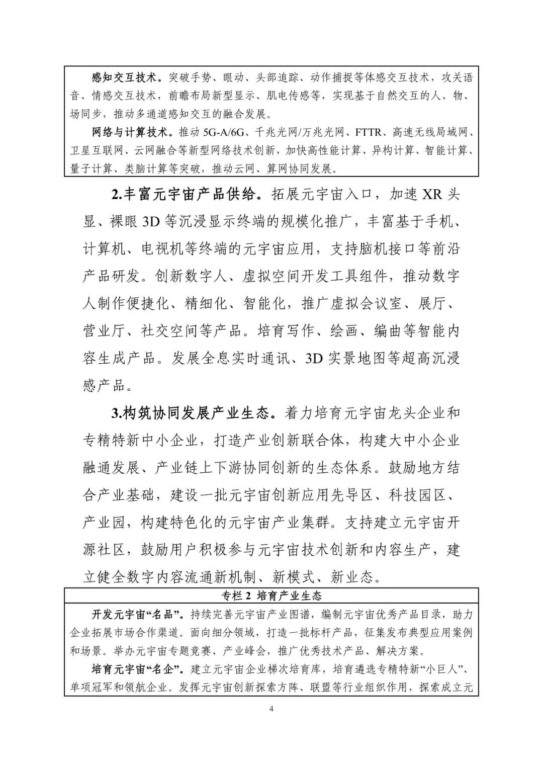 《行动计划》针对我国核心技术不强、产品不丰富、产业规模偏弱等发展瓶颈问题,提出进一步强化人工智能、区块链、云计算、虚拟现实等技术在元宇宙中的融合创新,加快关键技术布局,加紧基础软硬件的研发创新,在高端电子元器件、建模软件等重点方向尽快取得突破。在元宇宙产品供给方面,围绕社交、文娱、办公等现实需求,在元宇宙入口、虚拟空间应用工具和平台上着重发力。同时,《行动计划》倡导做强市场主体,培育元宇宙龙头企业和专精特新企业,建设一批元宇宙创新应用先导区、科技园区和产业园,打造特色化产业集群,并探索用户参与的技术创新和内容生产新模式新业态。