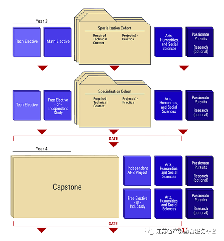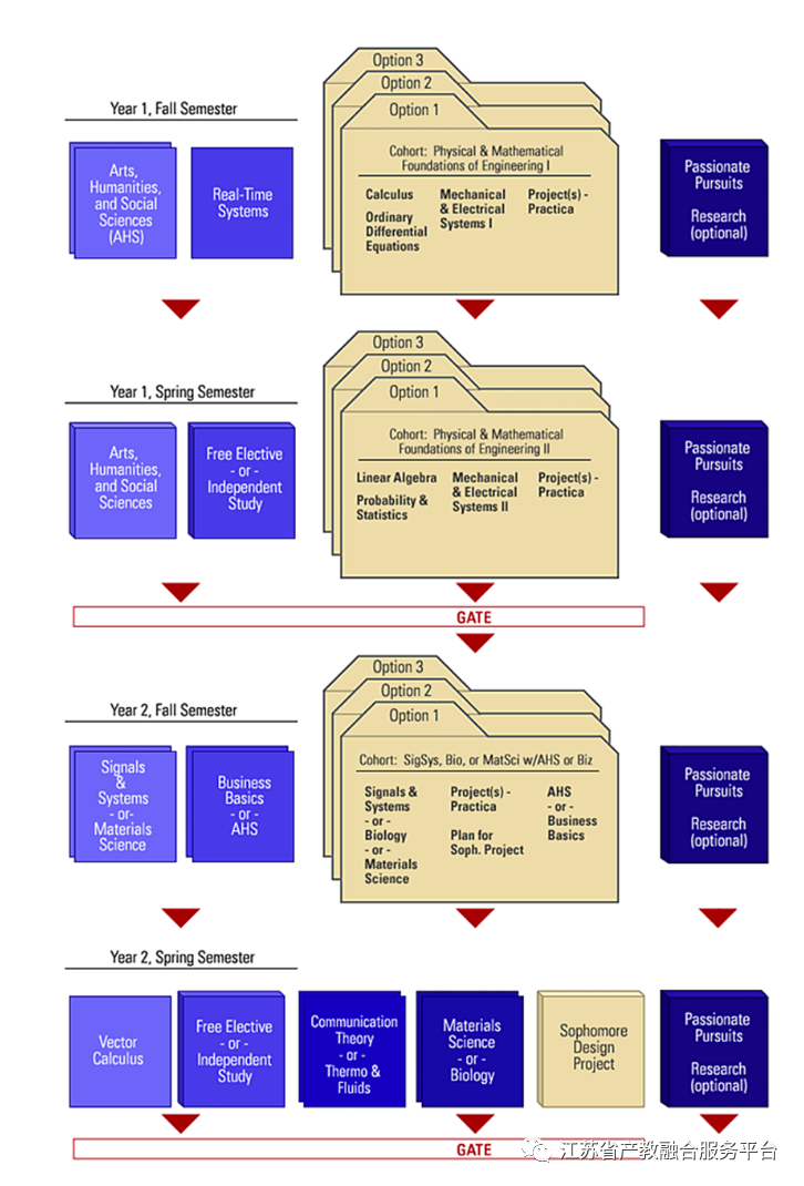 既然提到了招生和入学考试,那也不得不说到欧林工学院独特的考试制度:门关(Gates)。从下图中能够看出,每一学年之间,都有一个“大门”。每一学年末,全校会开始一周的考试测评周,检测学生是否达成了这一学年的目标,这个目标是整个学院设定的,而不是单一课程的讲师设定的。“大门”的考试内容不仅仅是笔试,还包括了口试、小组合作等等,让学生直接应用所学的知识进行设计,并将成果用报告的形式展现出来。