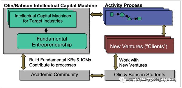 如下图所示,欧林与巴布森期望创业加速器(TEA)可以让信息在欧林和巴布森的学生与企业和其他创业团队之间流动,使得双方受益。TEA中的核型是创业数据库,被称为“知识资本机器”,包含了知识和案例两类,涵盖基本创业技能,以及创业研究的各种数据(包括成功和失败的创业尝试以及过程中的决策)。当一个新的企业(客户)希望使用TEA时,他们需要参与欧林和巴布森的一系列活动(如小组讨论、课程等),与学生合作,评估自己的创业想法。企业(客户)可以从“知识资本机器”中获取丰富知识和案例的经验,而学生则能够获得与真实企业合作并评估、改进真实创业/商业想法的实际经验。在合作结束后,客户将把他们的想法带回企业,作为回报,客户需要分享他们的经验,扩展“知识资本机器”中的信息案例,完成信息循环。