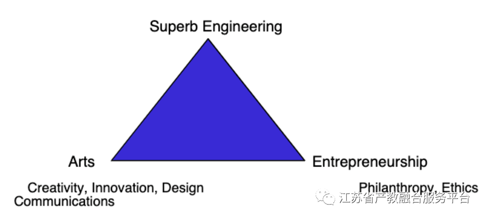 学校成立之初,欧林创始团队确定了两条学校的核心教育理念:“关注学生的全人教育”以及“尽可能激发学生全部的可能性”。基于这个教育理念,对欧林教育模式影响深远的“欧林三角”(Olin Triangle)正式被提出。