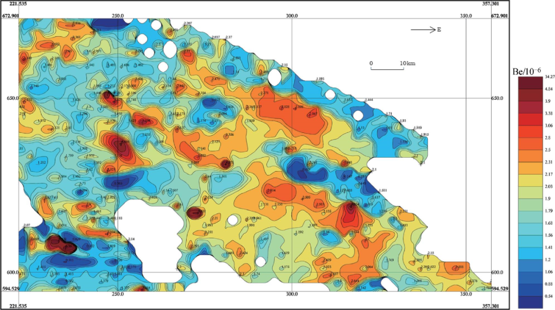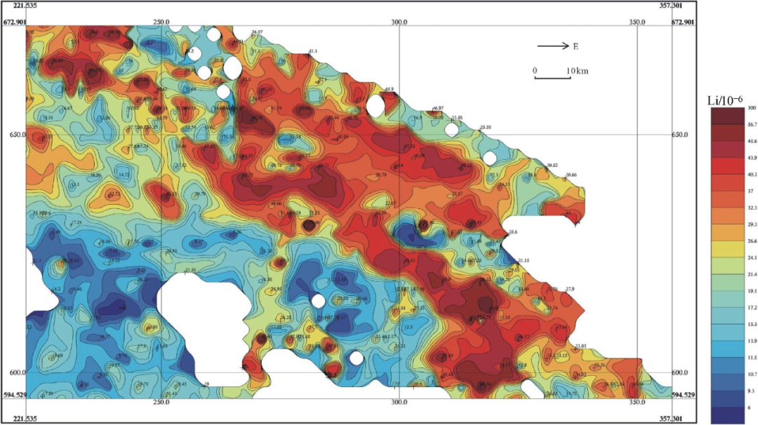 该成矿亚带西段主要分布煤矿、非金属矿产,而东段主要分布有色多金属矿产;这种矿产分布上的差异,反映出东、西两段地质构造环境和成矿作用差异性。在东部地区发现与混合岩化伟晶岩有关的稀有多金属矿床,其中具代表性的矿床(点)包括乌兰沙柳泉锂云母绿柱石矿点、沙柳泉铌钽矿床等。阿尔金山南缘地区Cu、Ba、La异常带与阿尔金山山脉走向一致,北东-南西向展布,带宽不明,异常普遍偏弱;受后期温热液活动影响,部分La、Th、Nb、U元素套合较好,峰值较高,且多具二级、三级浓度分带。柴北缘东段察汗诺-大水桥地区存在着一条约40km长,且规模巨大的Li、Be异常带(图4,图5),初步圈定30余处以锂铍为主的稀有金属元素综合异常,划分为2个综合异常带:俄当岗-日虚失Be、La、Li、Nb地球化学异常带,日旭日-苏吉Be、La、Li、Nb地球化学异常带;且显示出异常规模大、强度高,Li、Be等元素套合好,整体呈北西向带状展布的特征。图4 柴北缘东段察汗诺-大水桥地区锂地球化学示意图