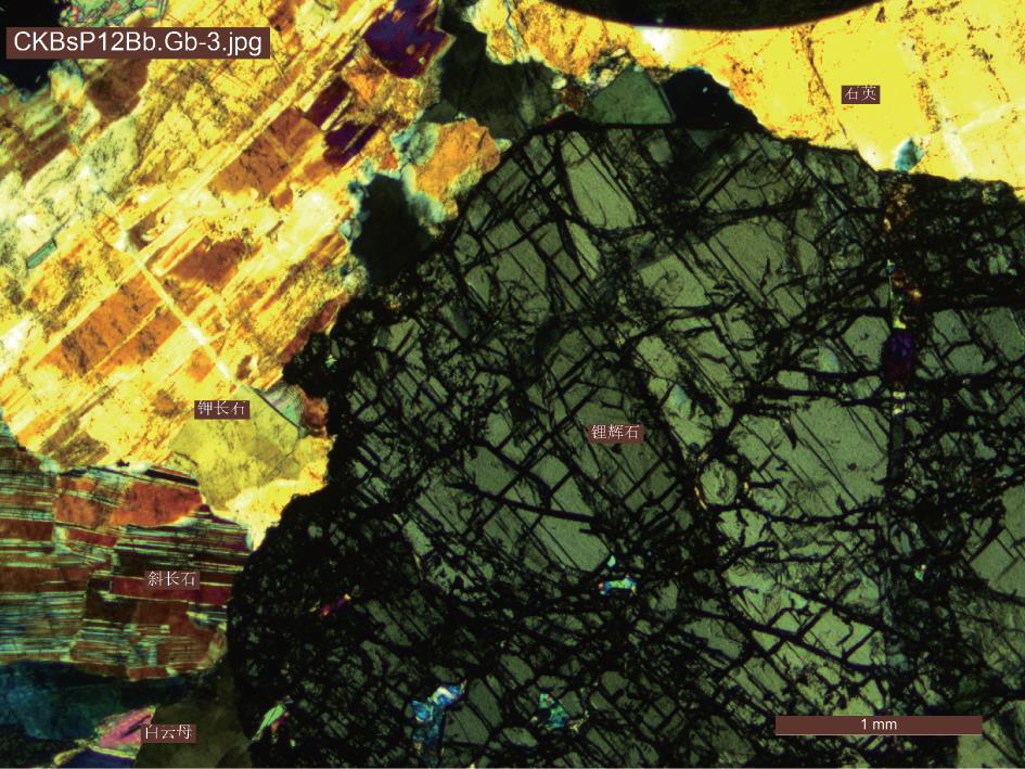 图9 锂云母花岗伟晶岩中锂云母呈片状或碎粒状