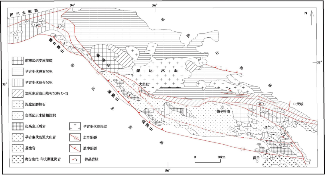 该亚带位于柴达木盆地东北缘,总体呈NWW向展布,西起大柴旦北的鱼卡,东止茶卡盐湖西部的哈莉哈德山,北到宗务隆山断裂,南以丁子口-乌兰断裂为边界。出露地层主要为古元古界达肯达坂岩群、中-新元古界蓟县系-震旦系万洞沟群、全吉群、寒武系欧龙布鲁克群、寒武-奥陶系滩间山群、志留系巴龙贡葛尔组、上泥盆统牦牛山组、三叠系隆务河组等;断裂构造主体发育为北北西向和北西向,次为北东向和北西西向;基性、超基性岩及中、酸性岩浆侵入活动、火山活动较强烈。