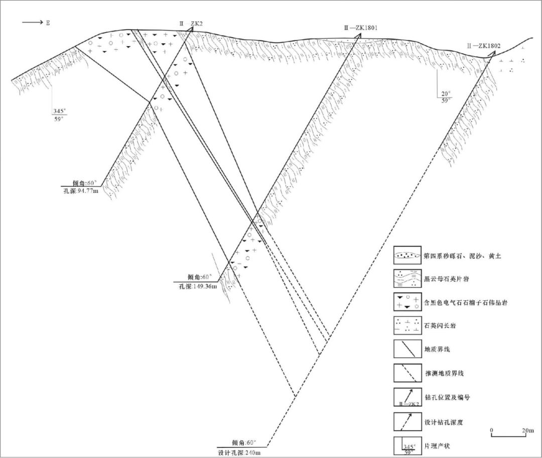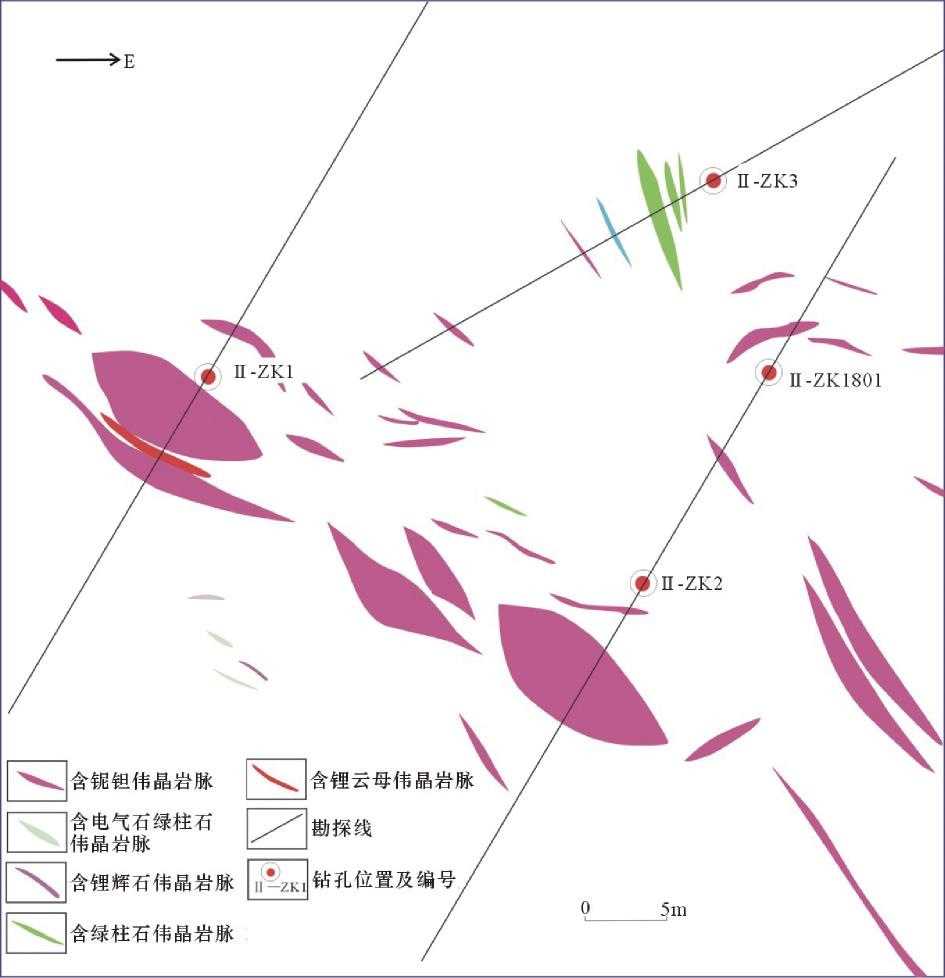 矿石矿物主要为锂辉石、锂云母、锂电气石、铌钽铁矿、铌铁矿、绿柱石等,脉石矿物有斜长石、微斜长石、石英、电气石等。含矿伟晶岩类型为钠长石锂辉石花岗伟晶岩、绿柱石花岗伟晶岩以及锂云母花岗伟晶岩等;以花岗伟晶结构为主,次为文像结构、蠕虫状结构、残余结构及花岗鳞片变晶结构,块状构造和条带状构造。随着伟晶岩成岩过程交代作用高度演化,残余热液中富含大量碱金属,挥发组分浓度增高;随着钠的交代,锂、铯、钽等元素含量增高,云英岩化作用强烈,形成锂云母,并伴生有少量早期锂辉石矿物,矿物组合主要是石英、钠长石、锂云母,构成锂云母型花岗伟晶岩。矿区内断裂构造发育,呈北西向展布,延伸稳定,沿断裂两侧伟晶岩脉较为发育。在内压力和构造应力的作用下,岩浆熔融体沿早期形成的构造裂隙侵位于地层中的薄弱面、构造裂隙及节理,区内断裂、次级裂隙及派生发育节理是伟晶岩脉的主要控岩作用。矿区内II-ZK2中见到与地表对应的厚大花岗伟晶岩,岩石中见少量星点状绿柱石不均匀分布,在孔深34.16m处可见少量紫红色锂云母沿裂隙分布,宽2~3cm,呈片状,破碎、碎块、粉末状。II-ZK1801中可见伟晶岩脉向深部延伸稳定,但厚度有变薄趋势,绿柱石含量较少。II-ZK1802于18.11~19.50m处发现白云母花岗伟晶岩,视厚度1.39m,45.41~46.38m,花岗伟晶岩,视厚度为0.97m(图18,图19)。图18 茶卡北山矿区II-ZK2勘探线平面图