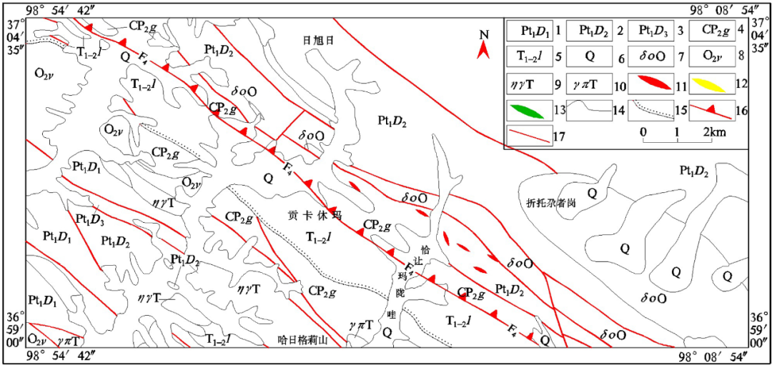 1—达肯大坂岩群片麻岩岩组;2—达肯大坂岩群片岩岩组;3—达肯大坂岩群大理岩岩组;4—甘家组;5—隆务河组;6—第四系;7—奥陶纪石英闪长岩;8—奥陶纪辉长岩;9—三叠纪二长花岗岩;10—三叠纪花岗斑岩;11—伟晶岩(未分);12—含绿柱石锂辉石伟晶岩;13—含绿柱石伟晶岩;14—地质界线;15—角度不整合地质界线;16—区域性断裂;17—断裂