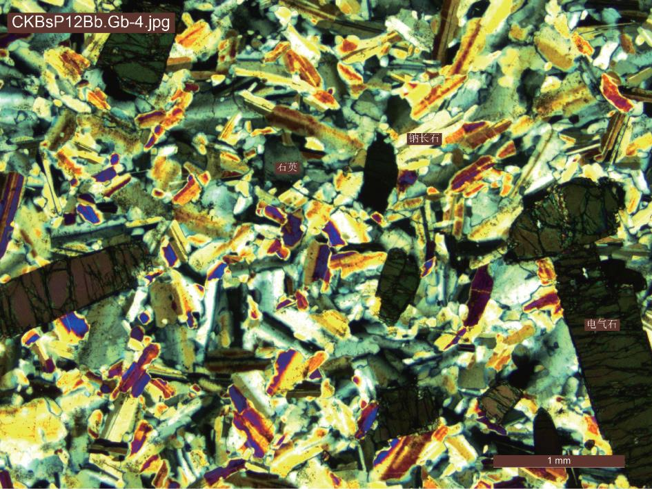 断裂构造发育,以北西向断裂为主,其次有北北西向、北东向、近东西向及近南北向断裂。侵入岩主要为二叠纪石英闪长岩、辉石闪长岩以及三叠纪花岗岩类等,其中石英闪长岩沿区域性断裂产出,呈北西向展布,部分伟晶岩脉呈超动侵入于该岩体中。脉岩较发育,分为基性岩脉、中性岩脉和酸性岩脉,其中酸性岩脉主要有花岗伟晶岩脉、花岗细晶岩脉、花岗斑岩脉等,花岗伟晶岩脉为主要含矿岩脉。伟晶岩脉主要产出于古元古界达肯大坂群、石英闪长岩中,伟晶岩脉具有成群、成带产出特征,岩脉呈大小不等的透镜状、团块状、瘤状、不规则脉状为主,脉体走向多为北西向,其次为北西向,少数呈南北向及东西向分布。目前,在区内已发现500余条伟晶岩脉,最长300m,—般5~60m;宽一般1~6m;地表土壤植被覆盖,伟晶岩脉露头相对较差,断续出露。锂、铌钽、铷、铍等稀有金属矿主要赋存于伟晶岩脉中,锂主要赋存矿物为锂云母、锂辉石以及锂电气石,铌钽产于铌钽铁矿、铌铁矿中,铍主要赋存于绿柱石、羟硅铍石中,铷无独立矿物,分散于长石或云母等矿物中。锂辉石呈板柱状晶,晶体长短轴在2.0cmX5.0cm~3cmX20cm,晶内见有不规则状裂纹,分布于长石和石英等矿物间隙(图13-15);部分伟晶岩中电气石呈板柱状晶,分布于钠长石及石英矿物间隙(图16)。部分绿柱石呈六棱柱状,晶形粗大,粒径0.5~1cm,最大可达2.5cm,长0.5~2cm,个别可达4cm,产于叠层状白云母及石英矿物之间(图17);锂云母呈片状晶,片径0.88~5.1mm之间,多以集合体片状分布于石英、钠长石矿物和裂隙之中,呈强云英岩化(图13)。图13 锂辉石与钠长石、石英、白云母共生