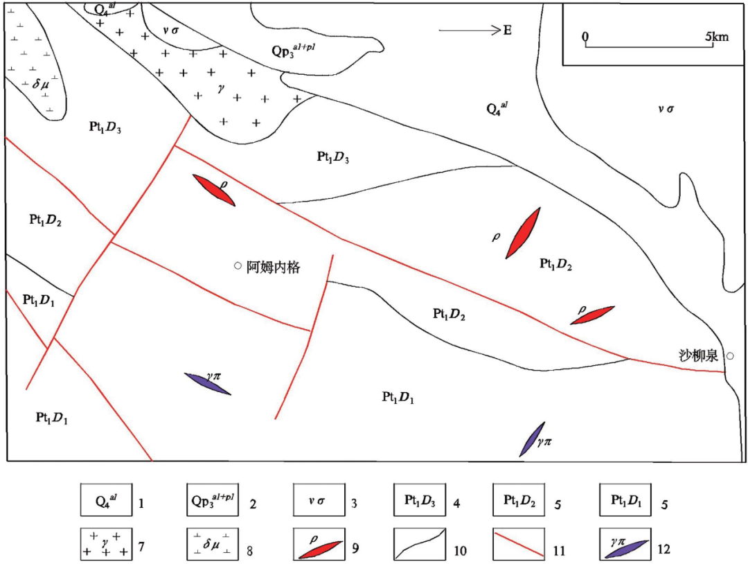 柴北缘地区锂等稀有金属矿主要产于伟晶岩脉中;伟晶岩脉宽一般1.5-30m,最宽400m,长一般几十米至百米,最长1800m,多呈脉状、透镜状、不规则脉状、似层状、串珠状等形态产出;一般为单脉,分支、分叉者较少,部分具狭窄、膨大的脉体变化。稀有金属矿种主要有锂、铍、铌钽、铷等,其中锂主要赋存于锂云母、锂辉石、锂电气石中;铍含矿矿物为绿柱石、羟硅铍石;铌钽多分散于其他矿物晶格中,部分形成铌钽铁矿、铌铁矿等;铷无独立矿物,多分散于锂云母、白云母及微斜长石等矿物中。伟晶岩脉产出形态与区内次级断裂、片理、片麻理、节理、裂隙等构造特征相吻合,且脉体与围岩的接触界线清晰,反映出伟晶岩脉就位严格受构造控制的特点。沙柳泉铌钽锂矿区位于欧龙布鲁克-乌兰钨(铁、铋、稀有、稀土、宝玉石)成矿带东段,该带主体与全吉地块的欧龙布鲁克-乌兰元古宙古陆块体构造单元相对应,是青海省内稀有稀土矿的成矿有利地区之一。矿区内出露地层主要有古元古界达肯大坂(岩)群(Pt1D)、新近系、第四系等地层。其中达肯大坂(岩)群呈北西-南东向展布,是区内主要地层,普遍混合岩化,其中发育黑云母石英片岩和云母片岩混合岩化现象;褶皱、断裂构造较发育;断裂以北西向阿姆内格山南逆断层和北断层为主断层,规模较大。区内岩浆活动以海西期中酸性侵入活动为主,明显受北西向断裂带控制,岩体出露较少,主要在西北角有少量灰白色花岗闪长斑岩及角闪正长岩,侵入于古元古界达肯大坂岩群。脉岩较发育,主要有伟晶岩脉、花岗岩脉、花岗闪长斑岩、煌斑岩脉等;其中伟晶岩脉(ρ)多分布于矿区东段(图7)。图7 沙柳泉铌钽矿区地质简图