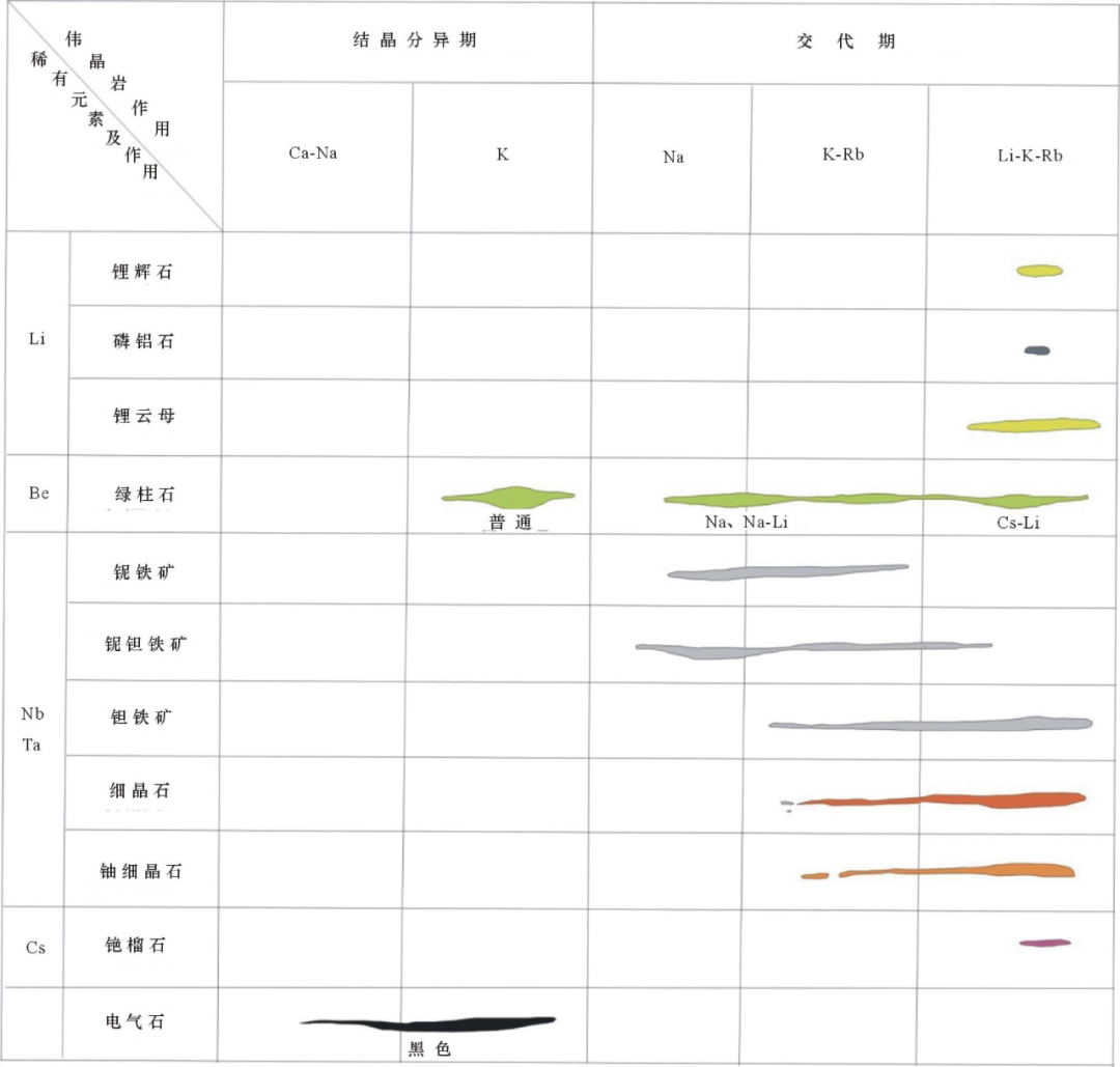 花岗伟晶岩为花岗质岩浆分异结晶及交代作用演化的派生物。由于花岗质岩浆分异演化总趋势朝着“碱性”方向发展,原生结晶期造岩矿物主要为斜长石、微斜长石;交代期造岩矿物晶出顺序为钠长石、白云母、锂云母;原生结晶分异期之后伟晶岩作用进入了热液交代期,交代期为研究区稀有金属成矿的一个重要演化阶段(图11)。图11 沙柳泉矿区伟晶岩矿物成矿期及演化示意图